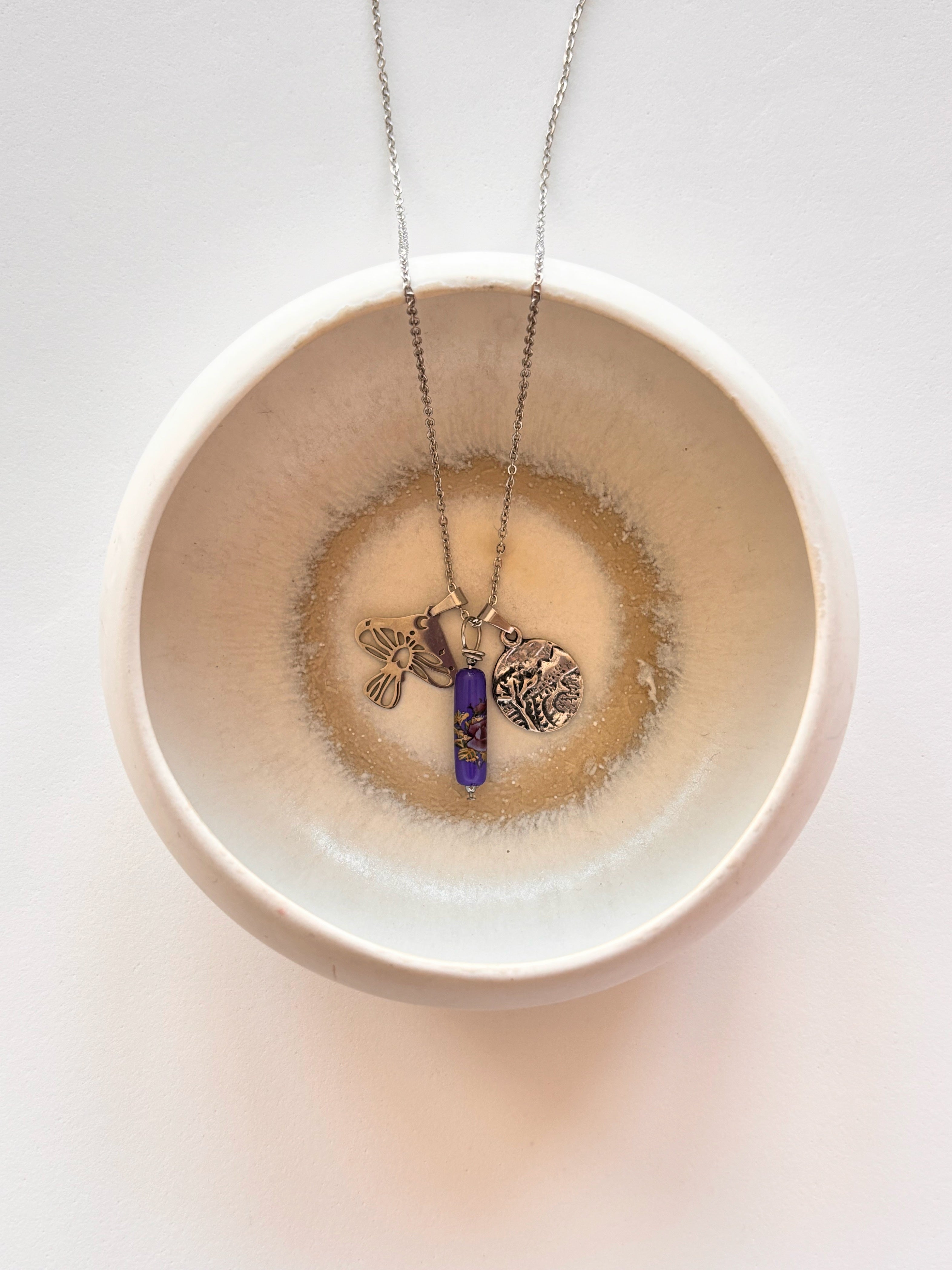 Collana Amuleto multicharms, composta da medaglietta con Occhio Greco colorato, portatore di buone energie, charm funghetto traforato e perlina in ceramica dipinta stile liberty.