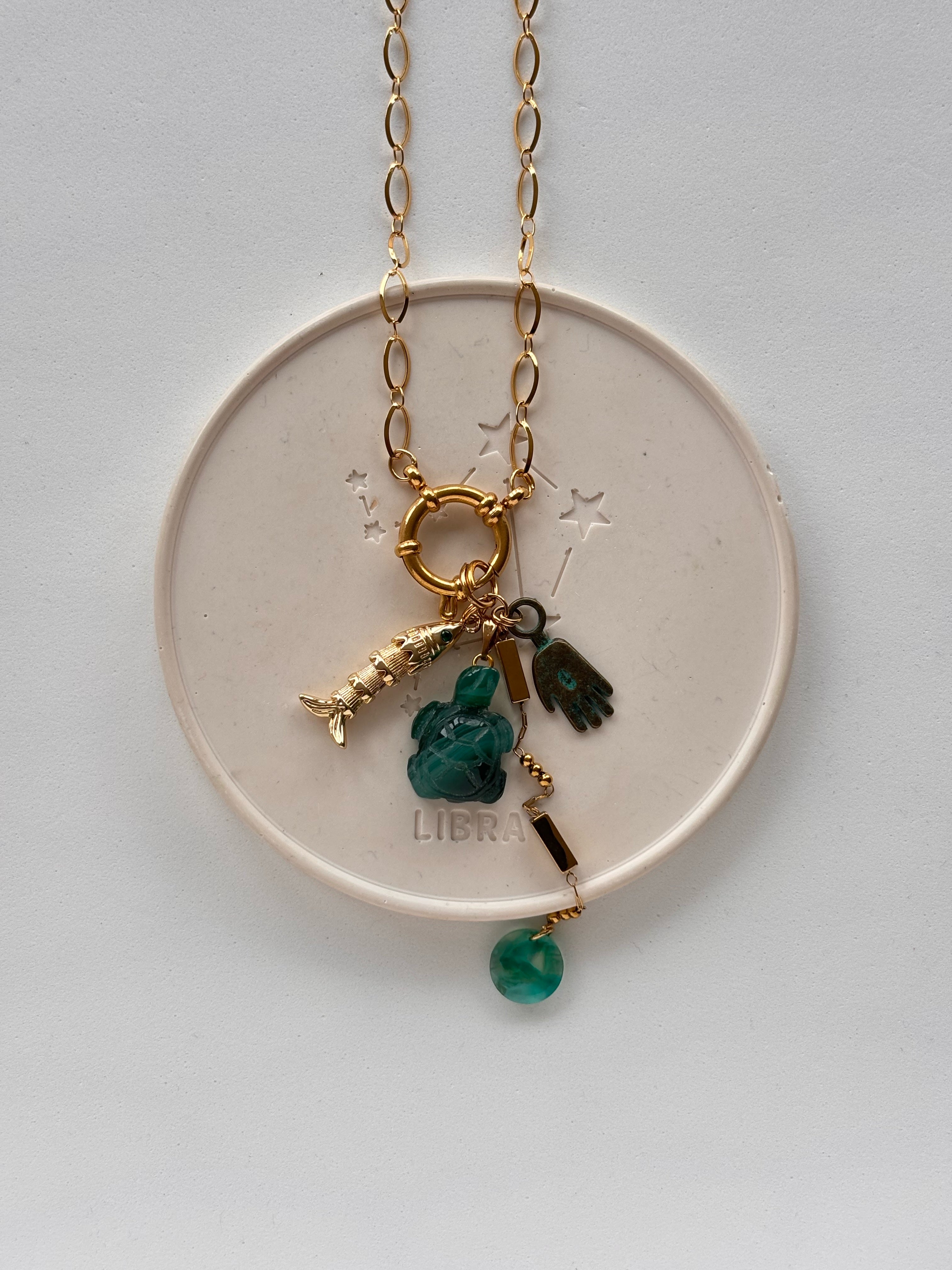 In questo gioiello troviamo una chiusura marinaio al centro sul davanti con vari charms uniti tra loro e nel dettaglio: pesciolino stile vintage, tartaruga in pietra dura, catenella effetto bronzato e manina in tono.