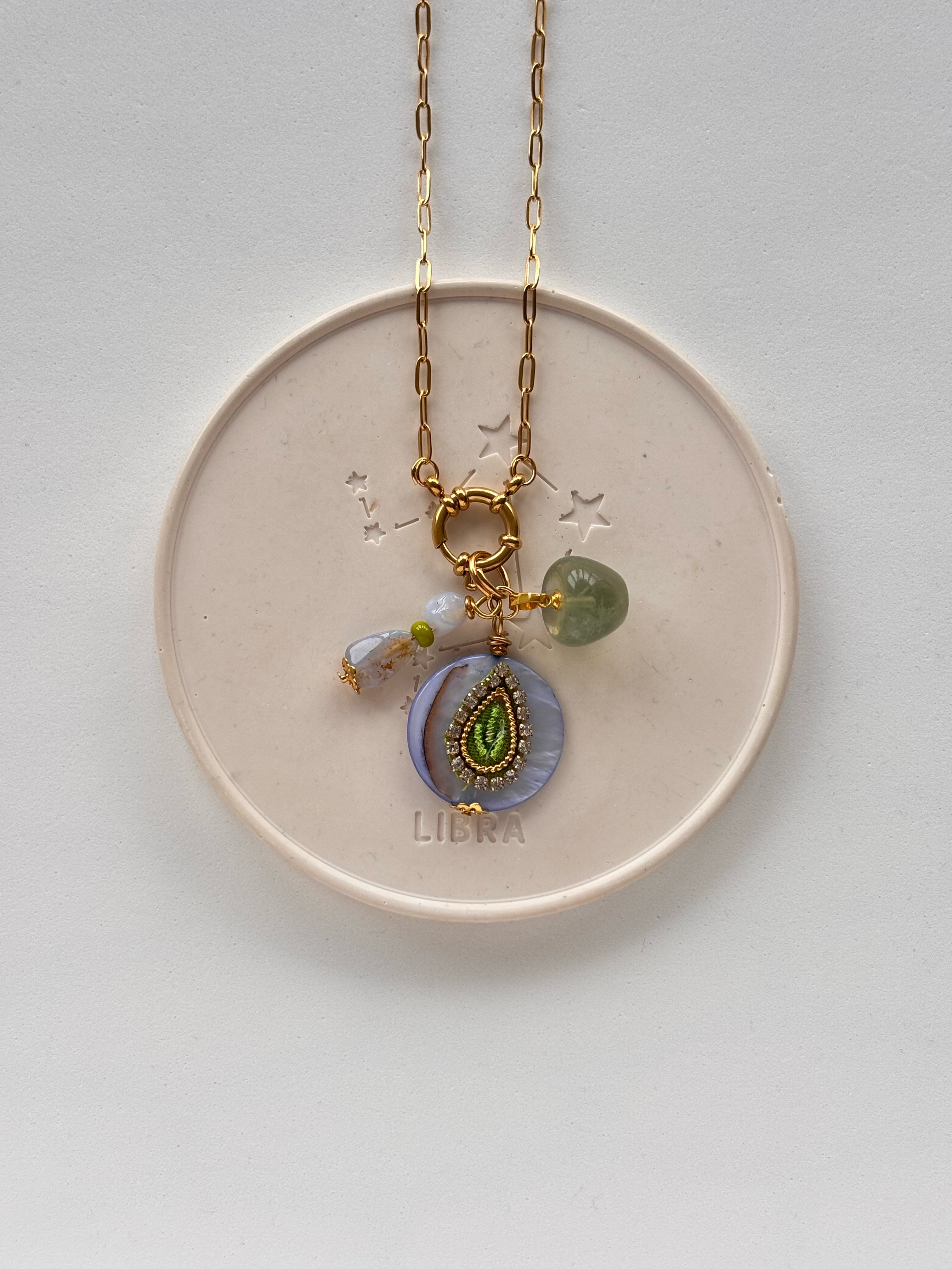 In questo gioiello troviamo una chiusura marinaio al centro sul davanti, che sostiene un mix di charms quali un medaglione vintage in madreperla, arricchito da un dettaglio paisley proveniente dallo Sri Lanka, due pepite in Calcedonio, pietra dalle proprietà riequilibrative della sfera emotiva, e piccola mela in Fluorite, in grado di aiutare nella concentrazione e nell’equilibrio.
