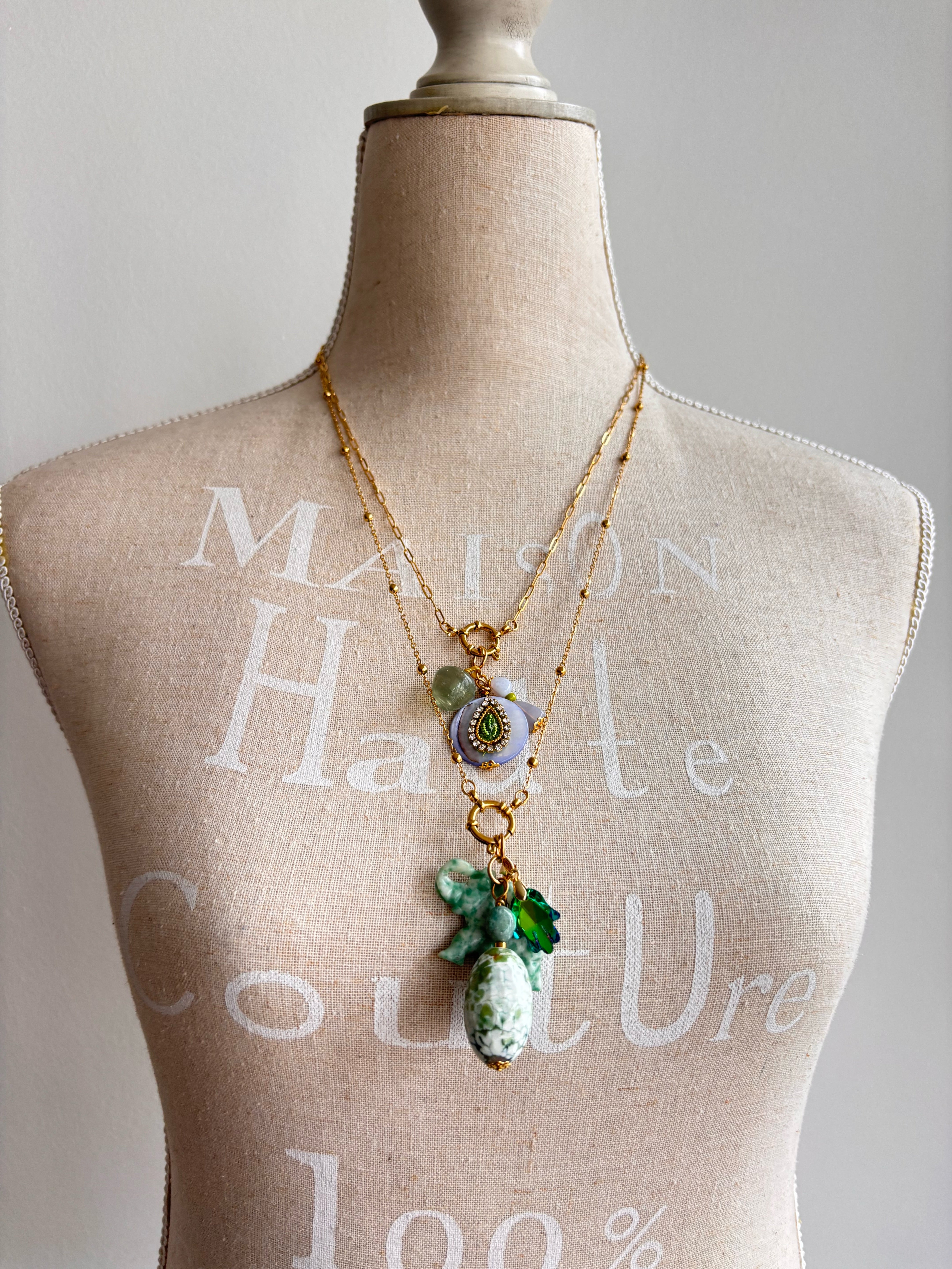 Collana Amuleto Mono-tono dove il colore protagonista è il glicine con tocchi di salvia.