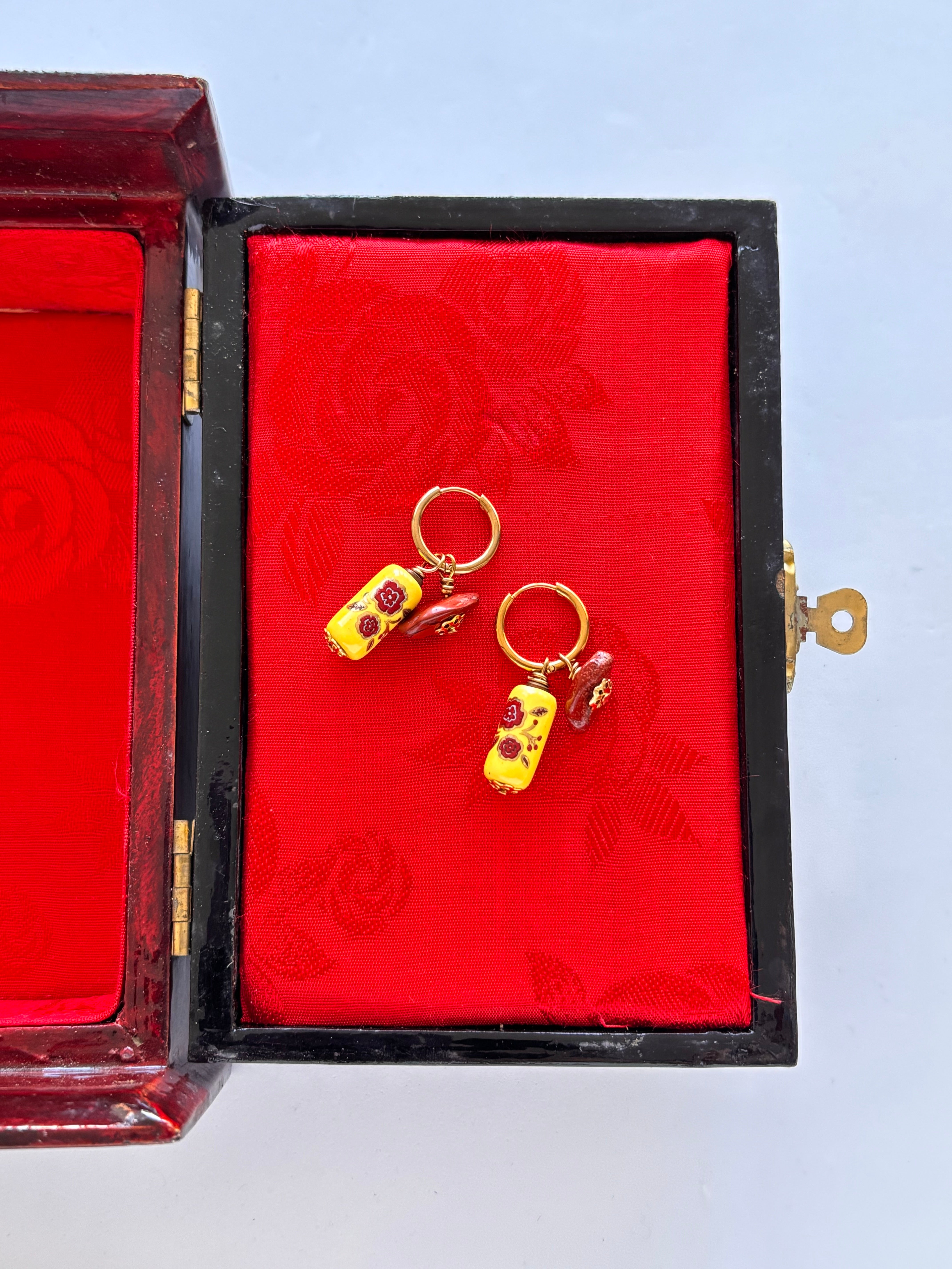 Una pepita vintage di Corniola, pietra dura simboleggiante vitalità e creatività, mixata ad una perlina in ceramica smaltata motivo floreale, si uniscono tra loro dando vita ad un gioiello che strizza l’occhio al passato.