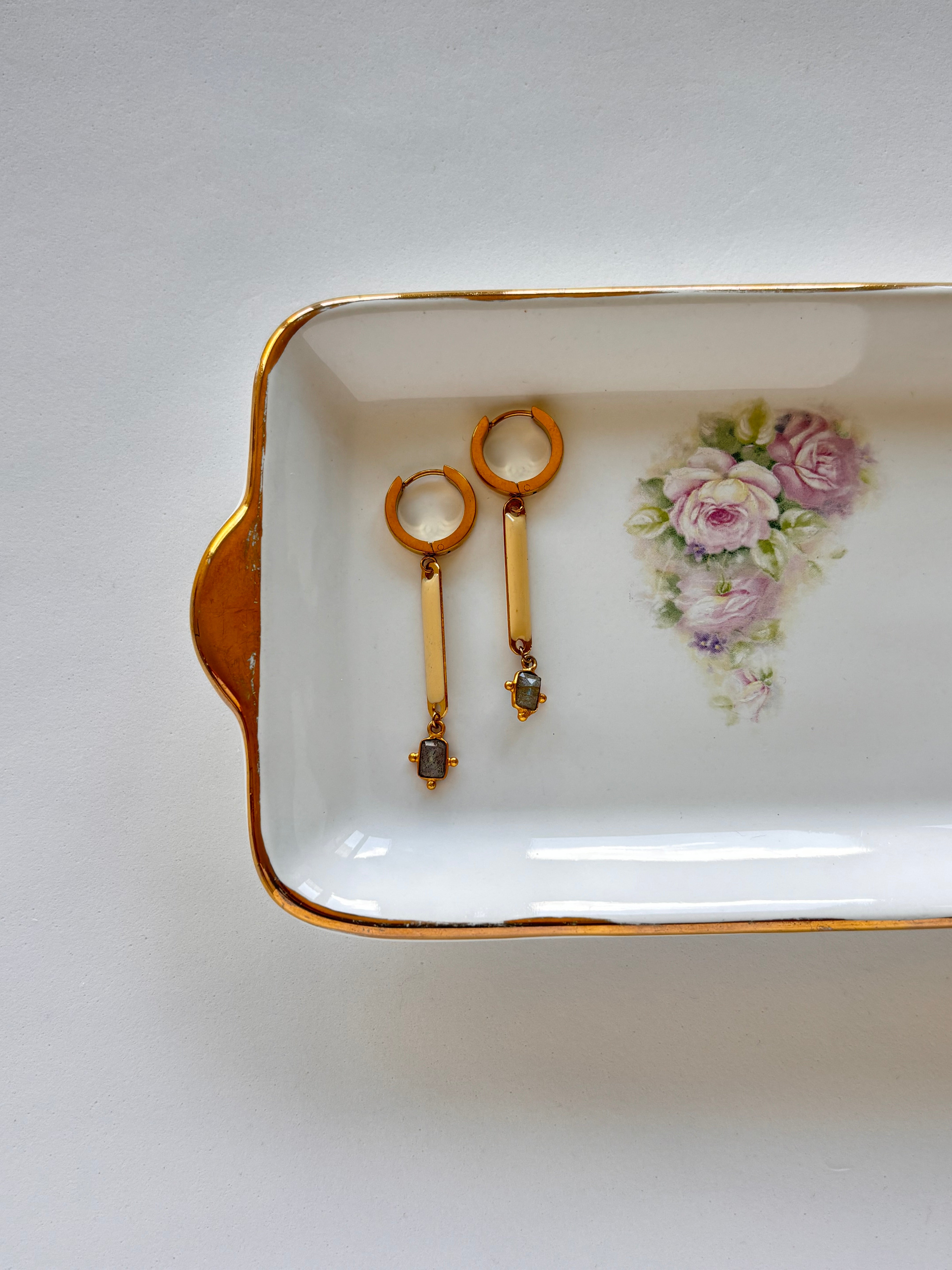 Medagliette smaltate color panna, provenienti dal mondo vintage e mixate a charm in Labradorite naturale, pietra della purezza. Cerchietto bombato in acciaio inossidabile.