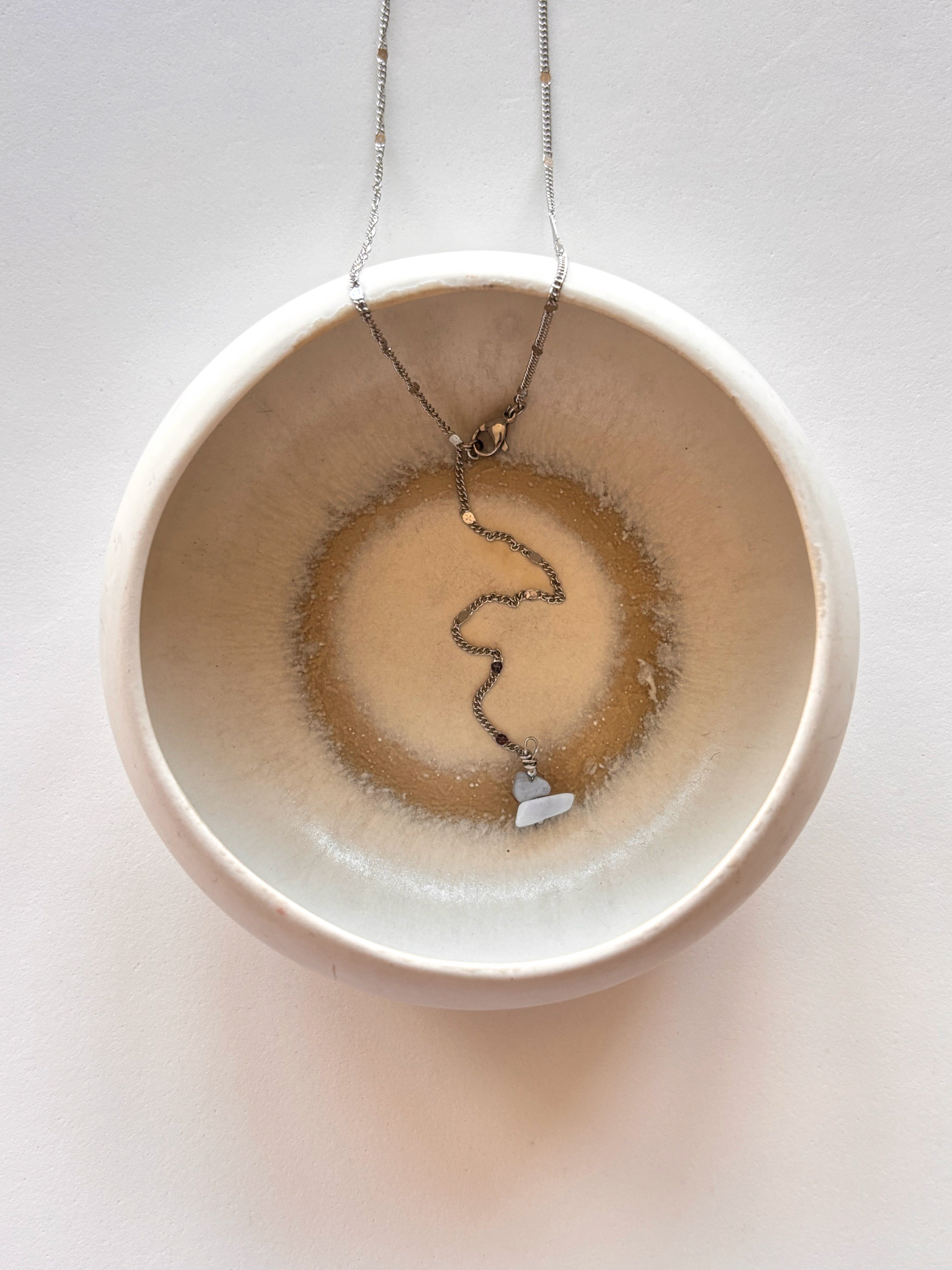 In questo caso il gioiello è composto da una catenella sottile con piccole monetine e pepite di Calcedonio, pietra del benessere psico-fisico.