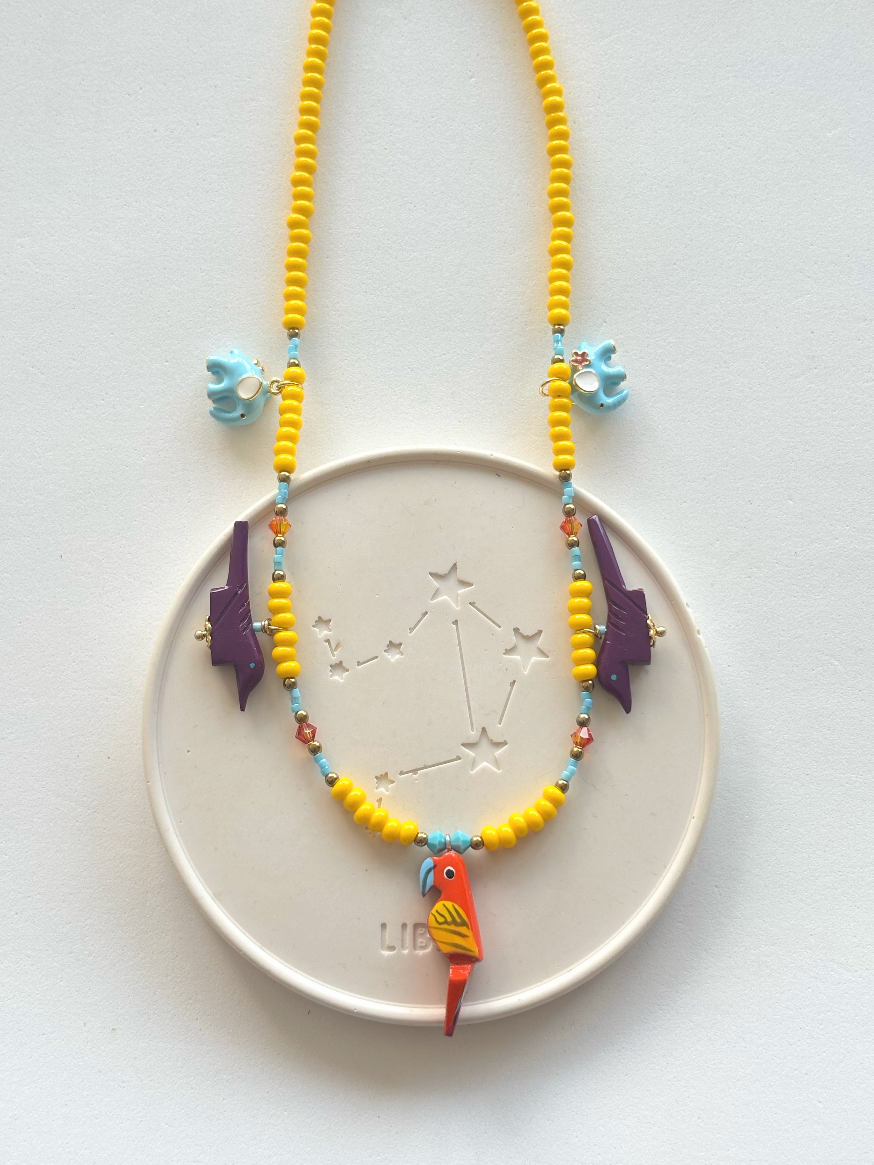 Protagonista è il pappagallo, realizzato in legno intagliato e smaltato, simbolo di purezza e fedeltà.