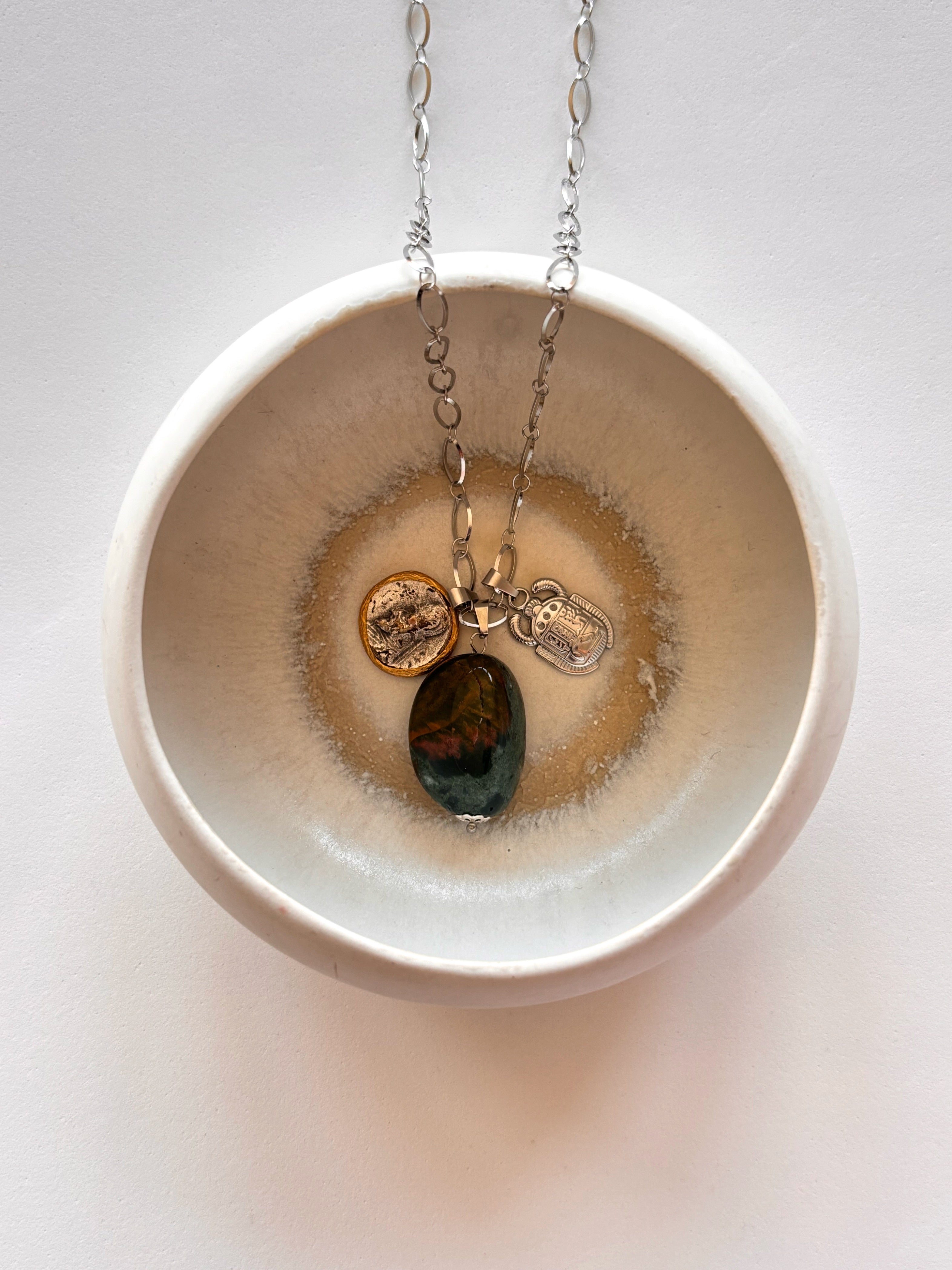 Collana Amuleto, composta da una maxi pepita in Fluorite, pietra della concentrazione e dalle capacità protettive contro le cattive energie, moneta di ispirazione greca con profilo oro e charm scarabeo, simbolo di rinascita.
