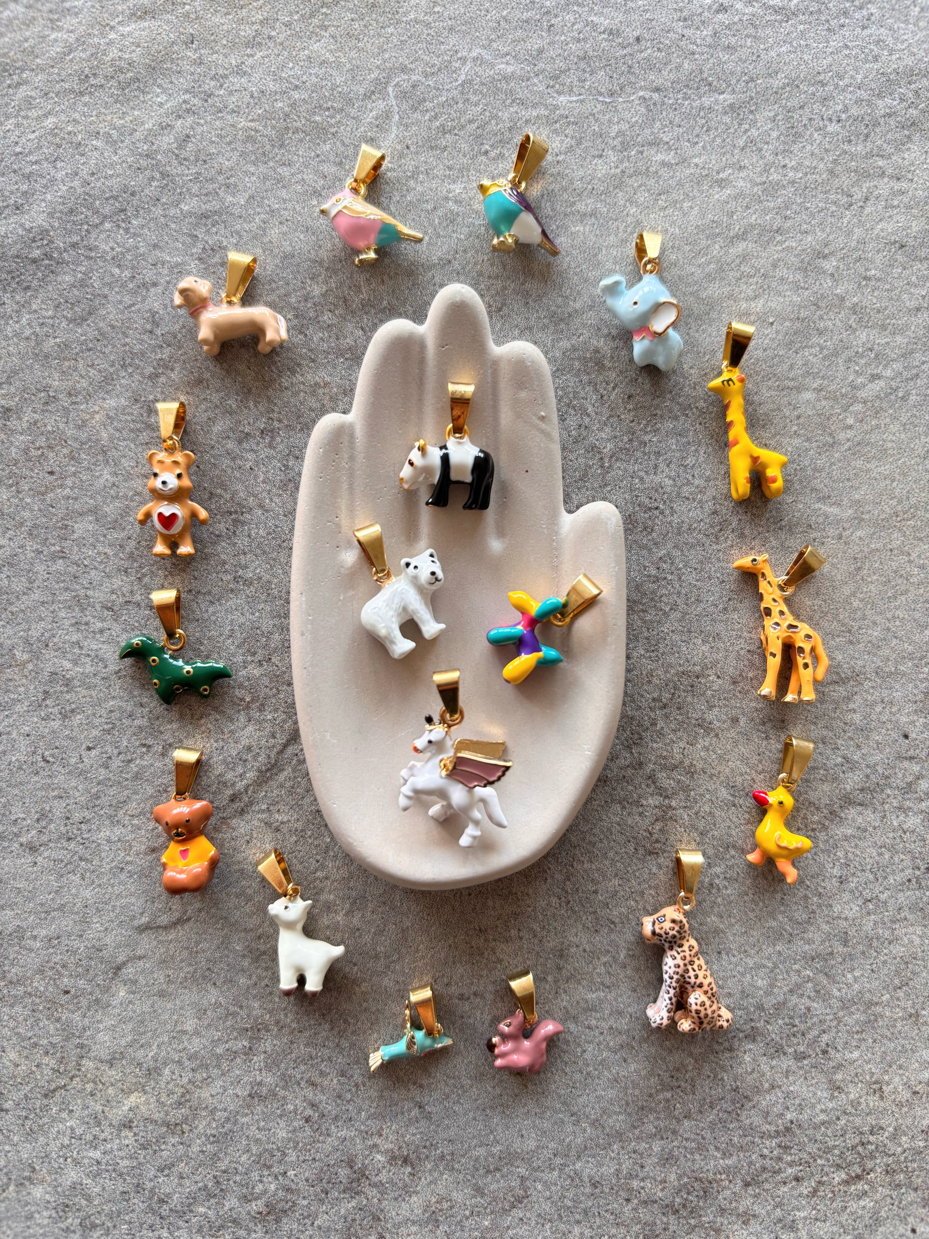 Tanti ciondolini smaltati con soggetti diversi ed uno più tenero dell’altro, a tema Arca di Noè.
