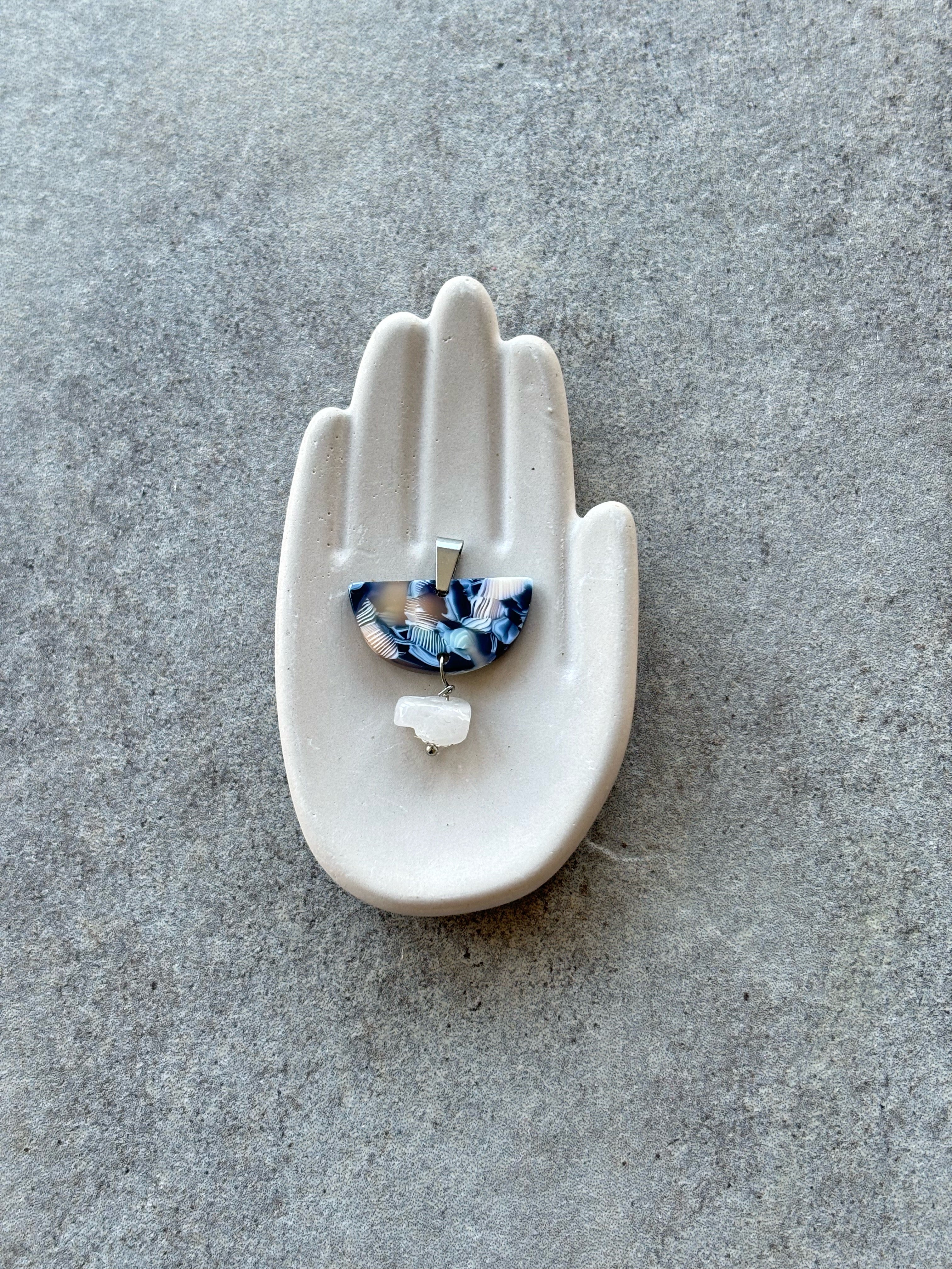 Ciondolo parigino in plexy dai toni gelati e piccola pepita a contrasto in Quarzo rosa, sul fondo.