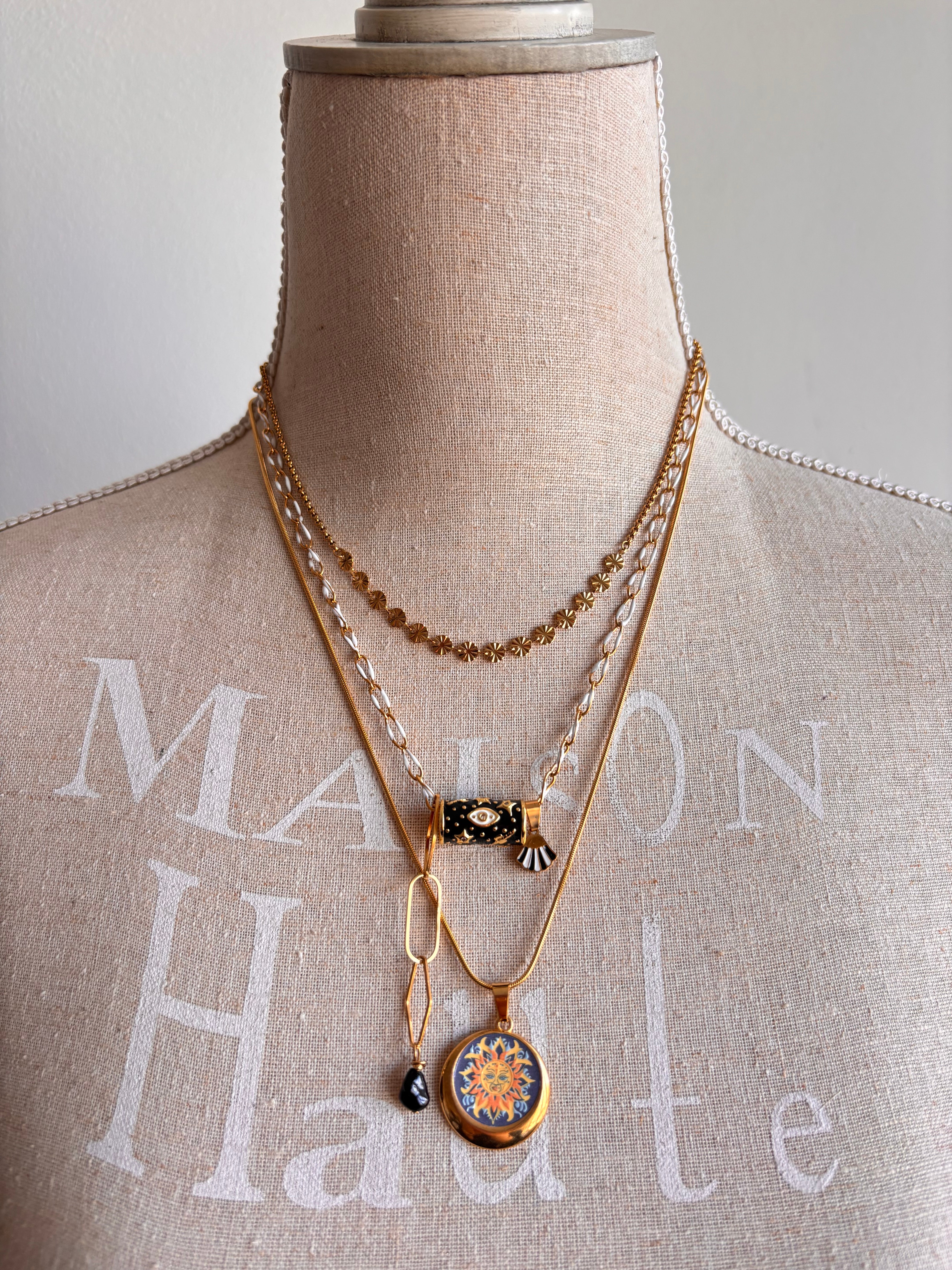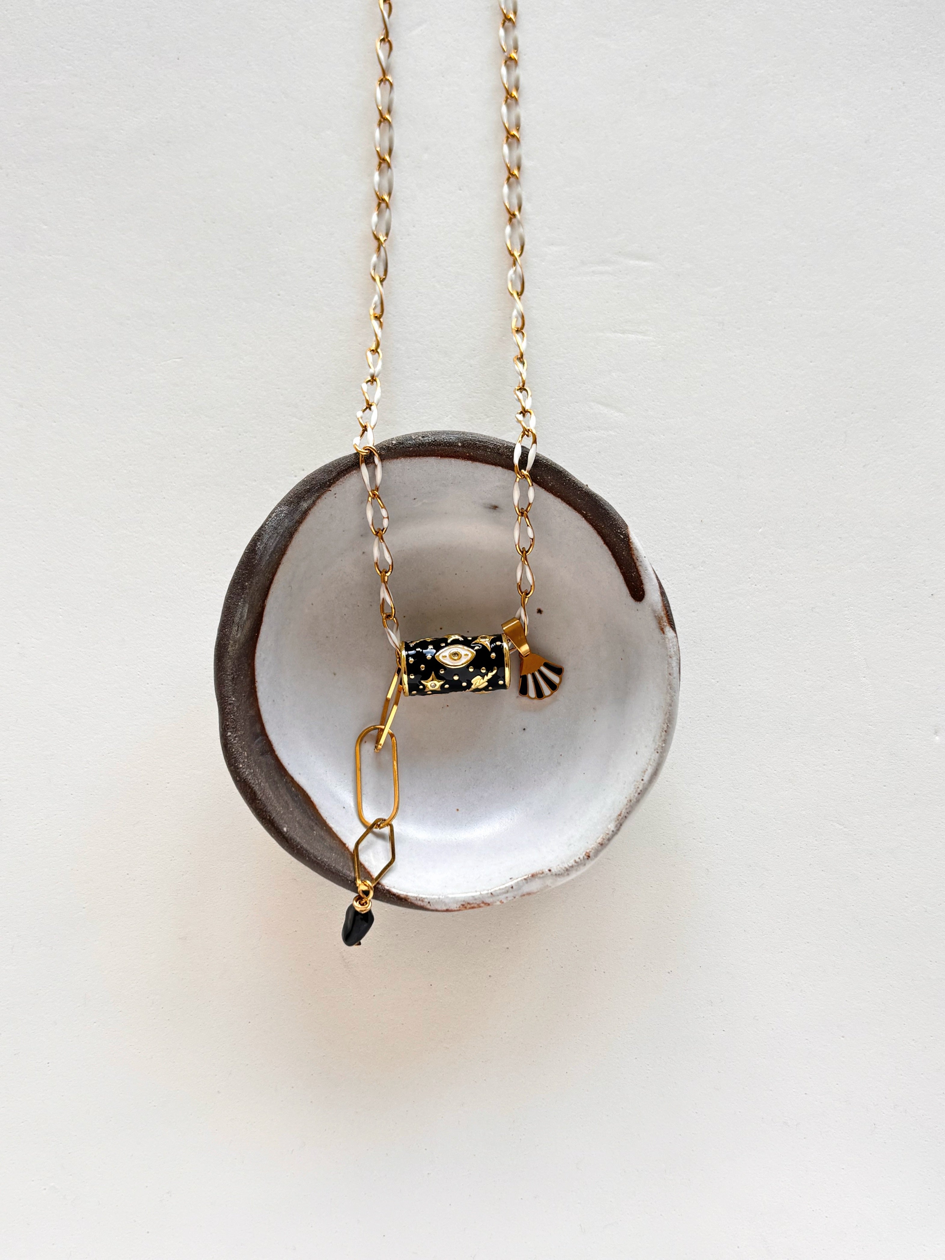 Un girocollo dal fascino astrale, grazie alla catena bianco latte, al ciondolo smaltato nero profondo e al design asimmetrico.