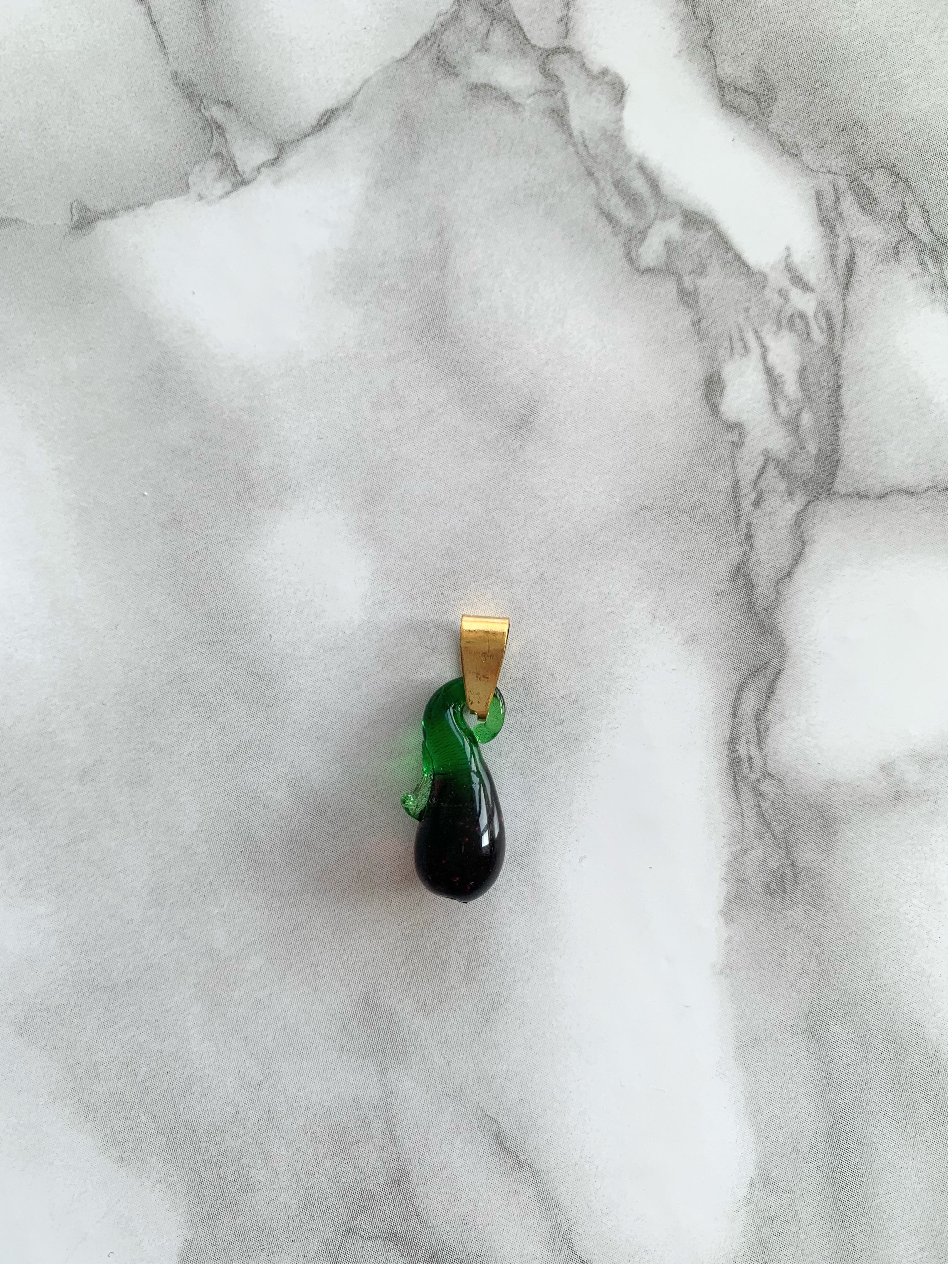 Ciondolo a forma di melanzana, realizzato in vetro di Murano. Anellino superiore in acciaio inossidabile color oro.