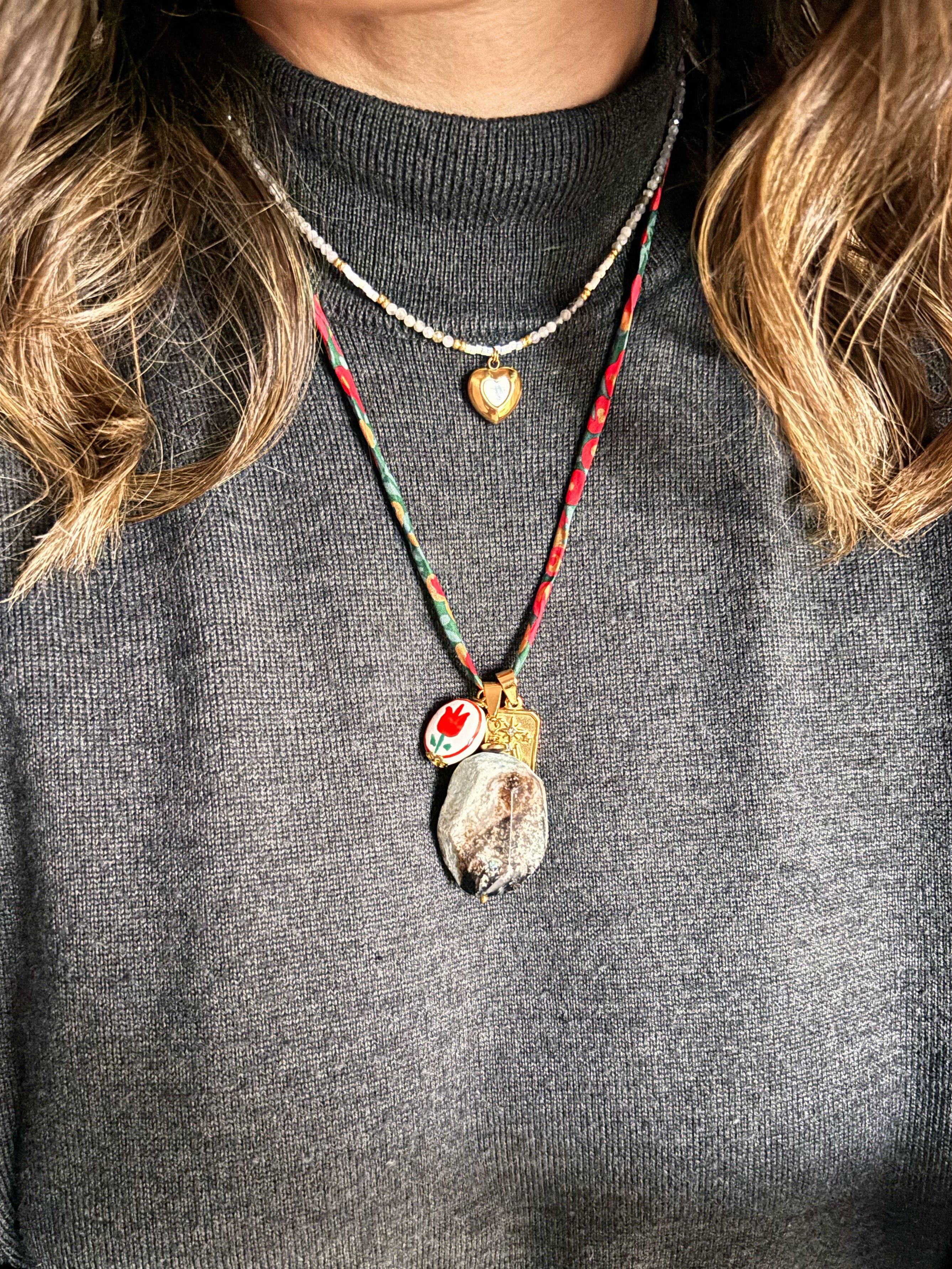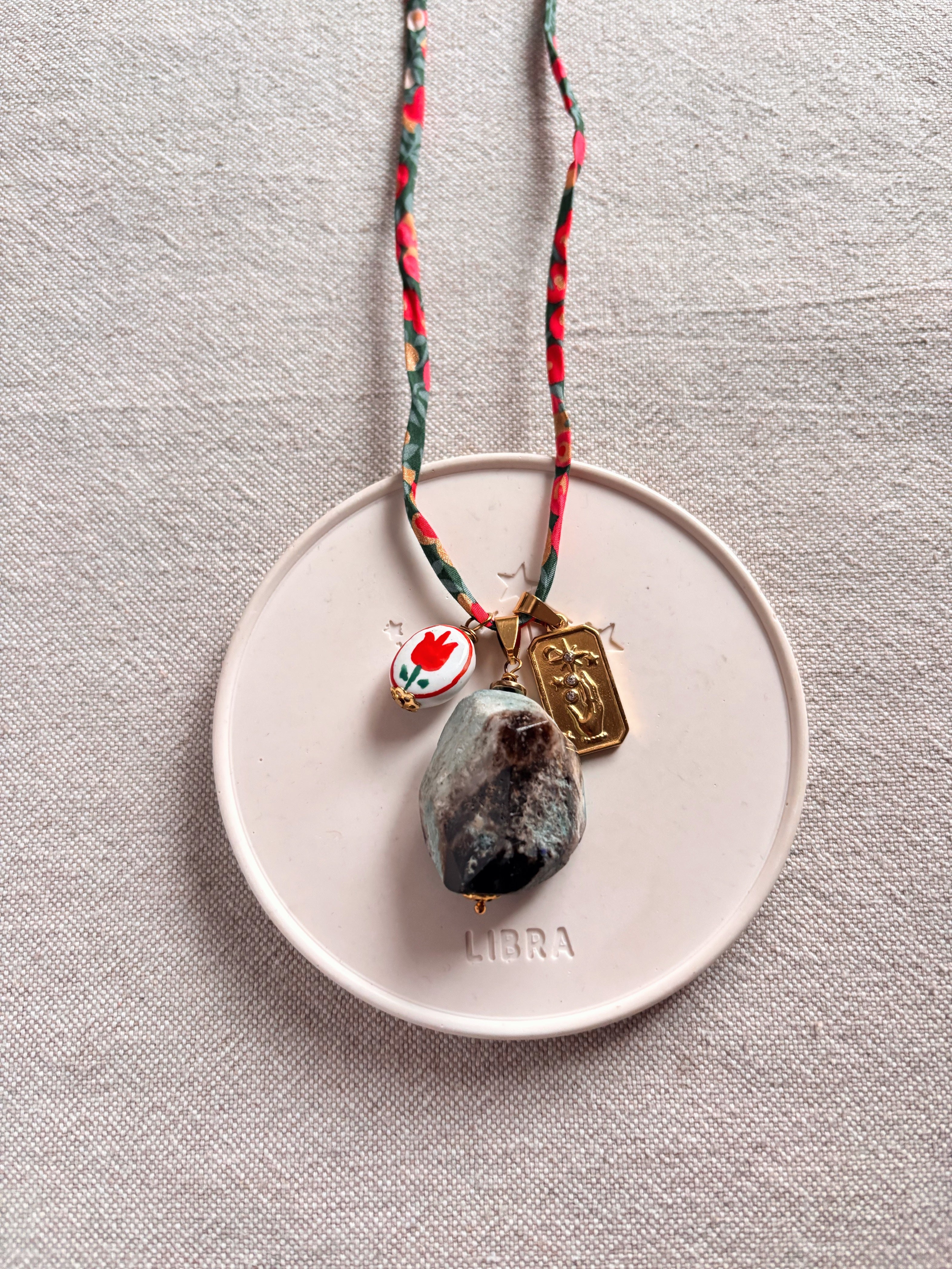 Collana Boho dal sapore marino e dai toni frizzanti, grazie al nastrino in cotone stampa liberty e i vari charms che la arricchiscono: una pepita in Agata inchiostrata naturale, pietra dell’equilibrio e dell’armonia, una medaglietta dal mondo Tarocchi e una perlina in ceramica smaltata.