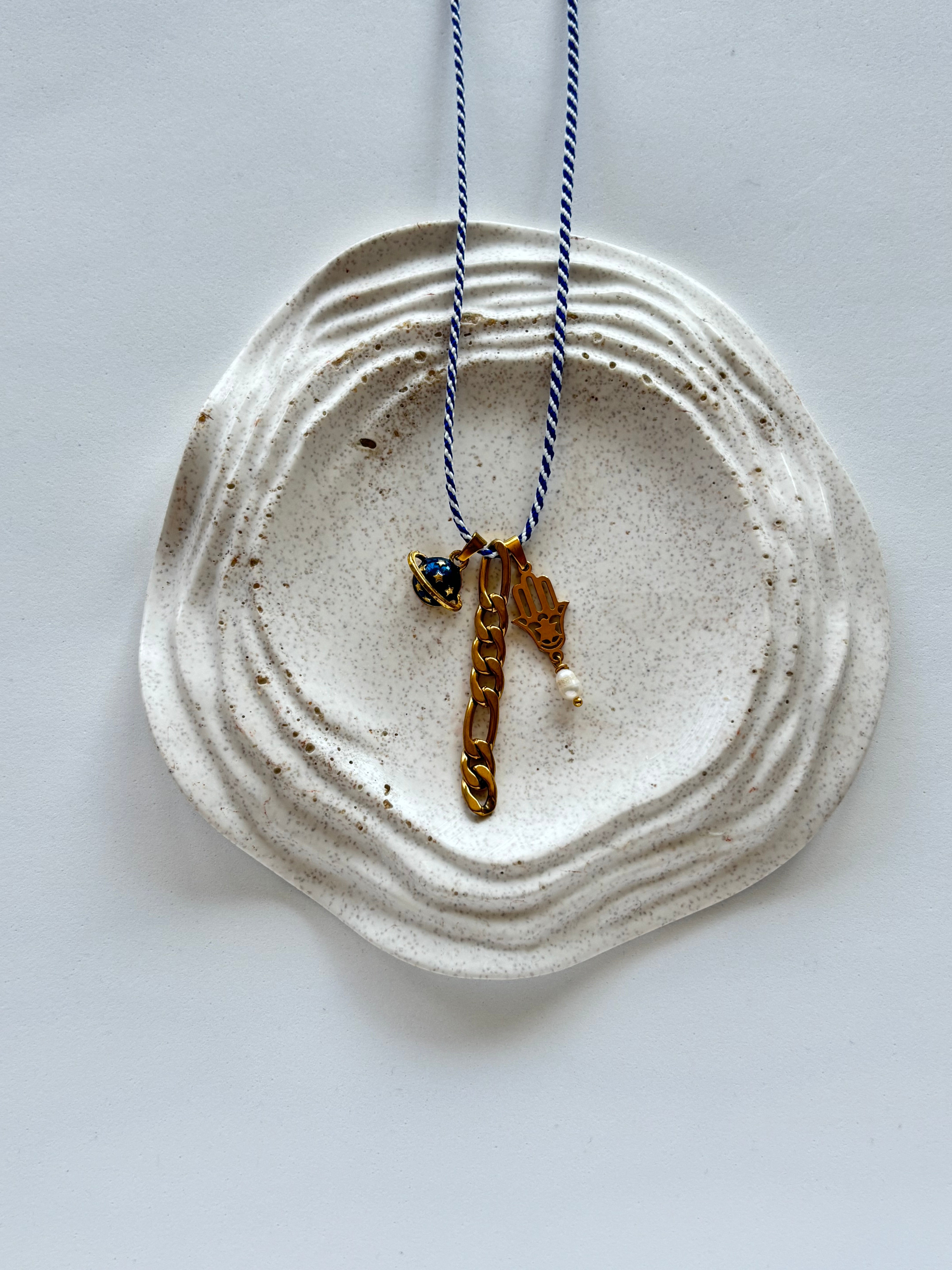 Collana Boho dalla lunghezza regolabile, composta da nastrino marinaio e charms decorativi.