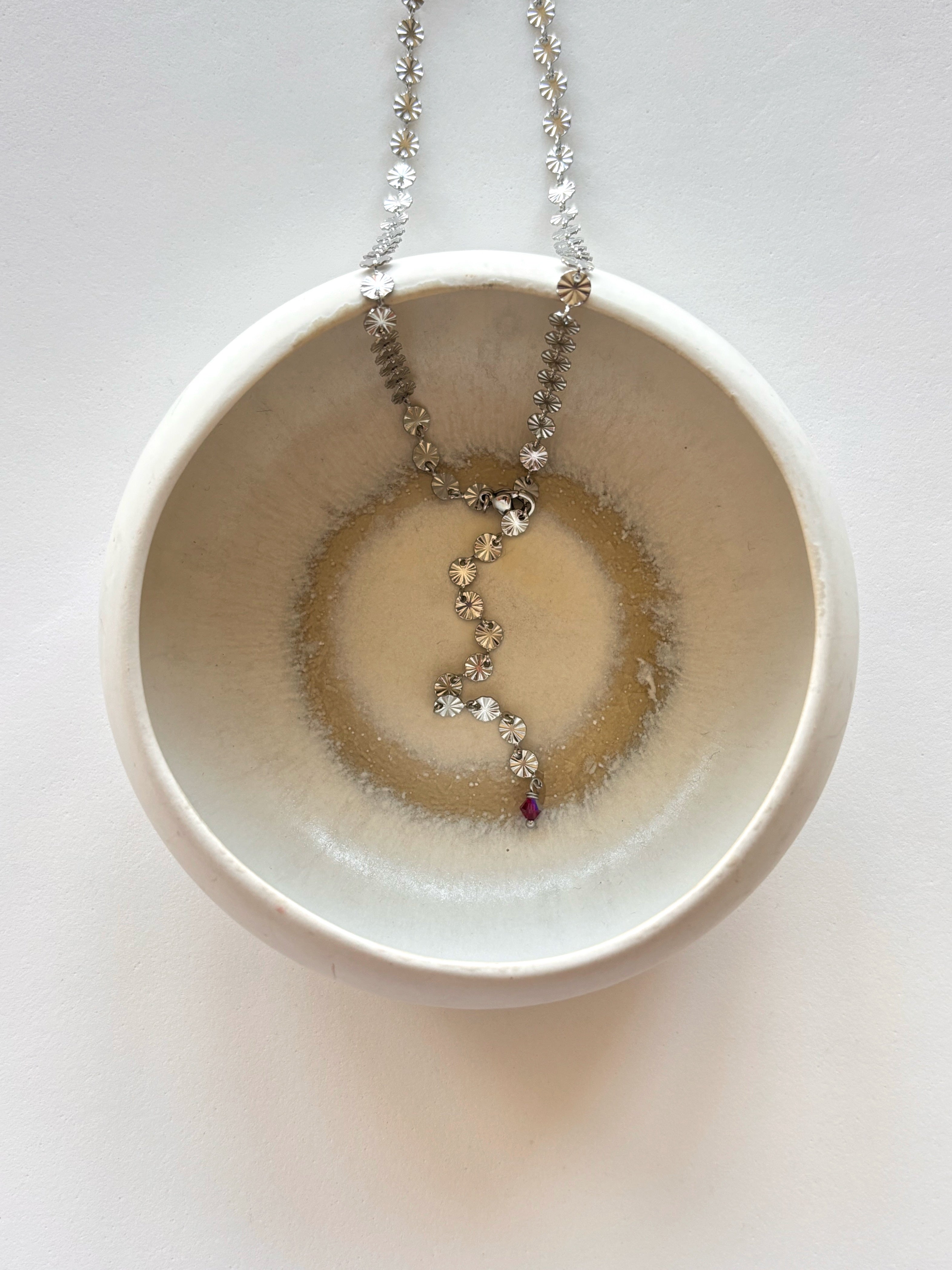 In questo caso il gioiello è composto da una catenella composta da monetine zigrinate e cristallo Swarovski sul fondo.