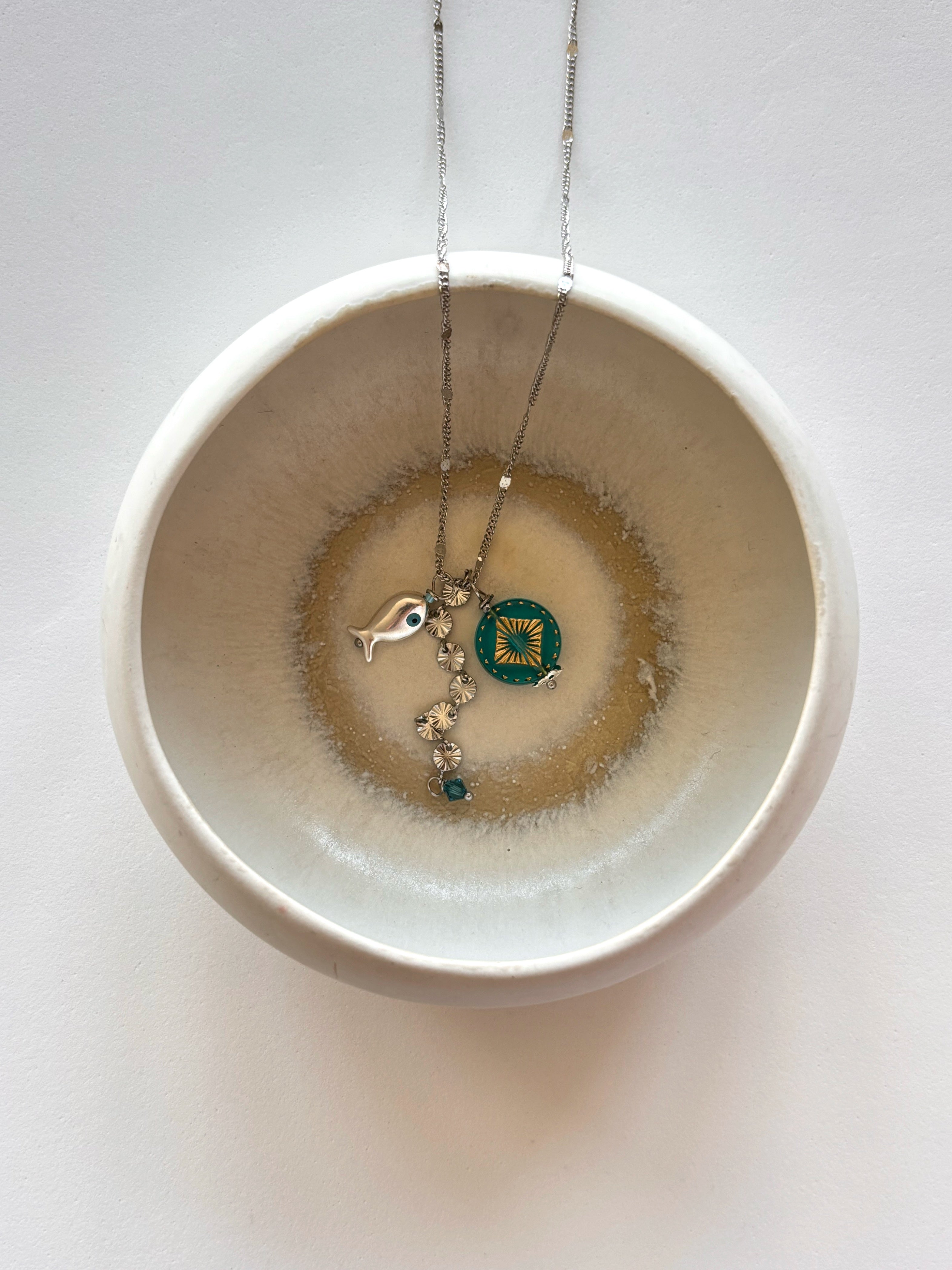 Ricorda le sfumature del mare dell Grecia, questa collana multicharms dai simboli portafortuna.