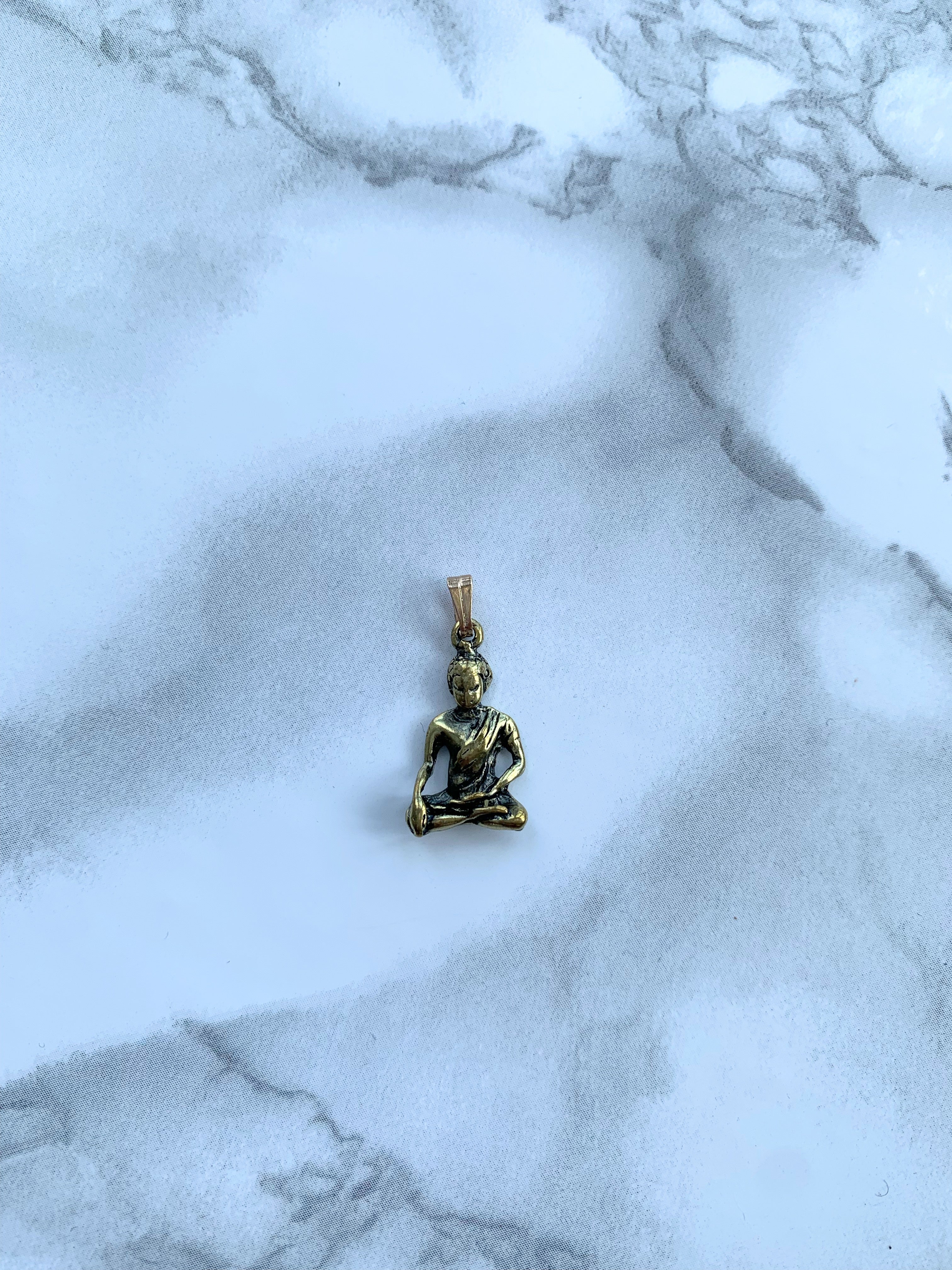 Ciondolo in metallo effetto bronzato, rapprentante un monaco in preghiera ed anellino superiore in acciaio inossidabile color oro.