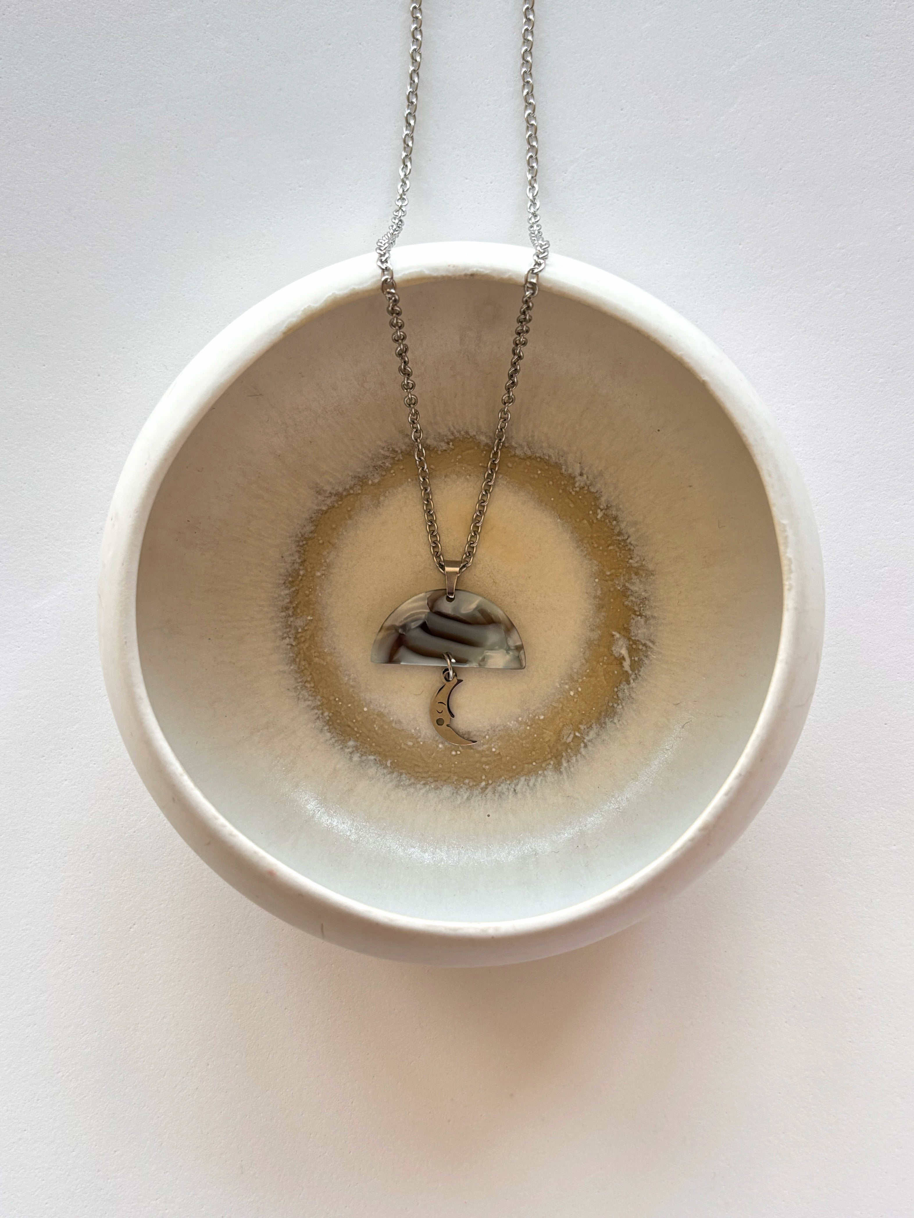 Girocollo delicato, sulle sfumature del grigio, all’interno del quale, se osservi bene, coglierai altri colori.