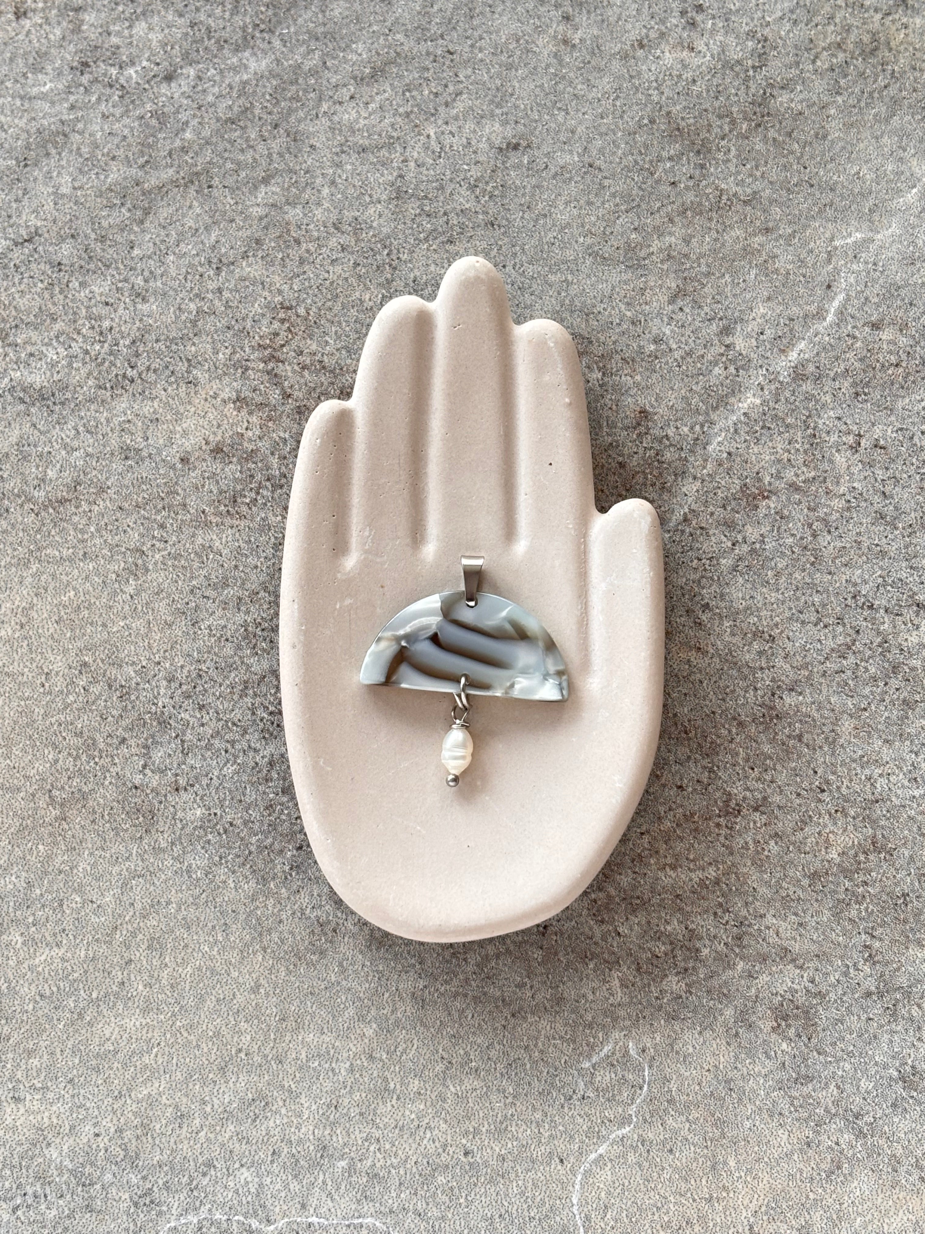 Ciondolo in plexy dai toni nebbiosi, arricchito da piccola perla di fiume sul fondo.