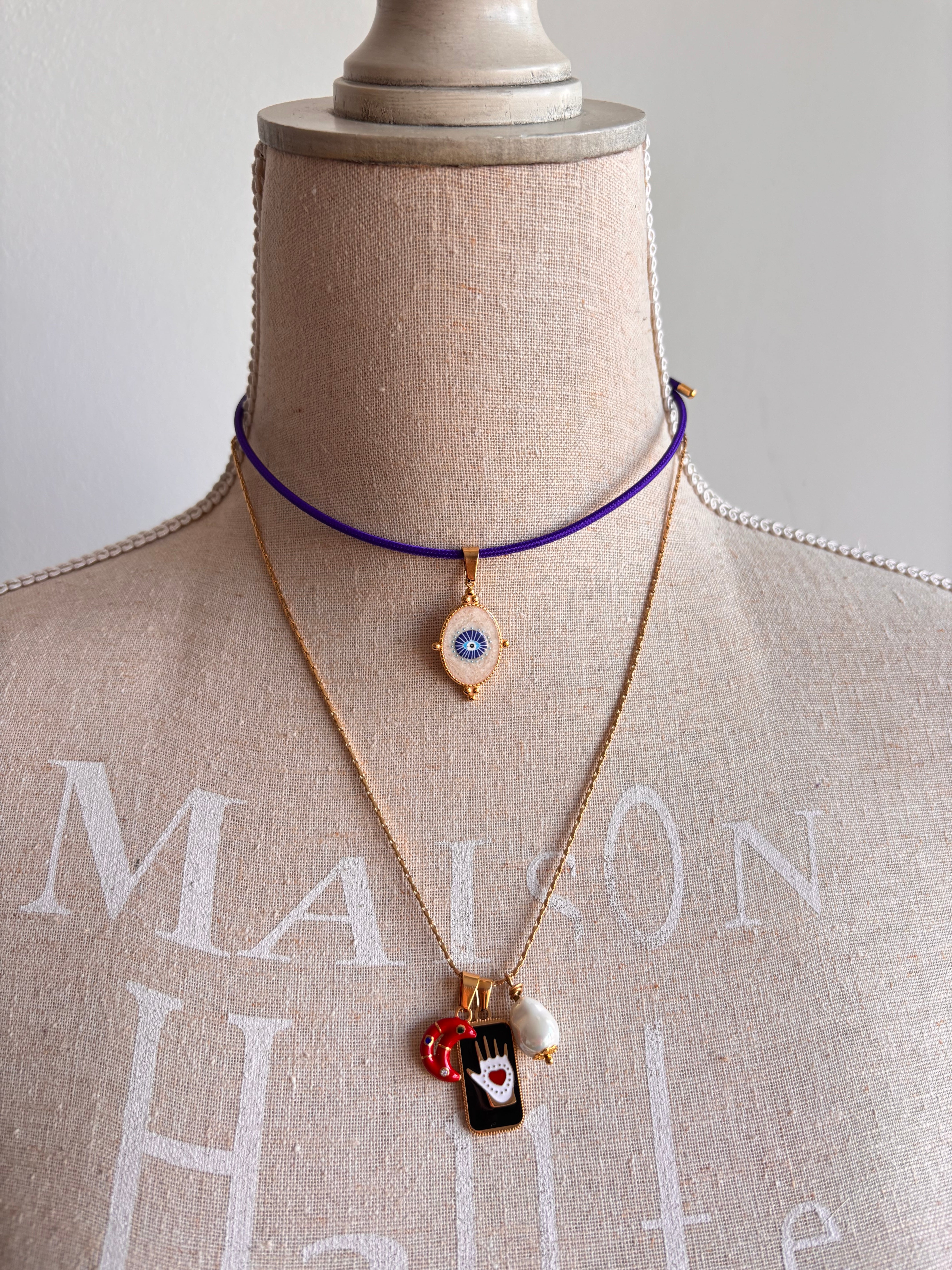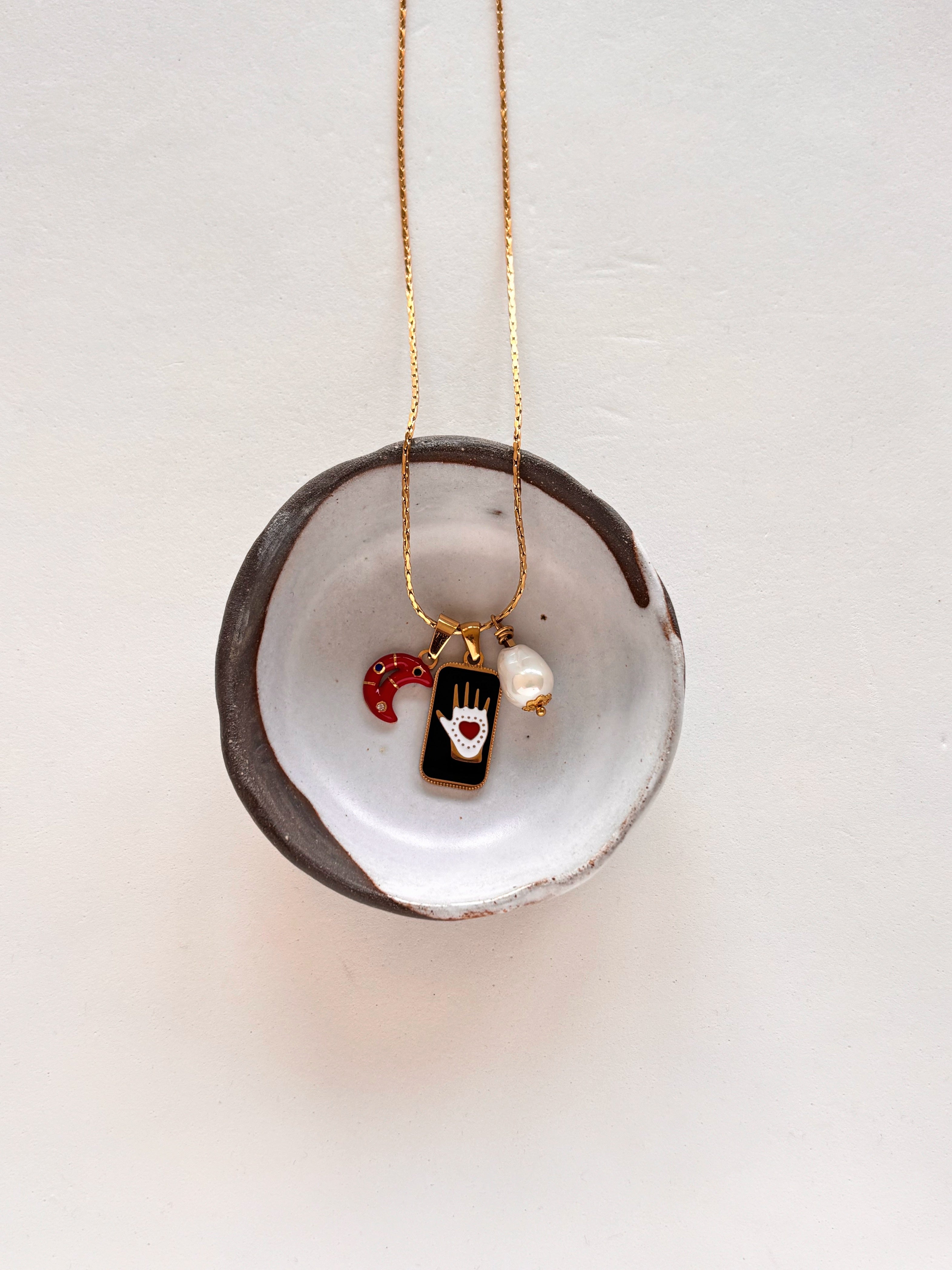 Collana multicharms da fascino magnetico, grazie alla medaglietta che richiama il design dei tarocchi, ripresi anche dalla mezzaluna smaltata al suo fianco.