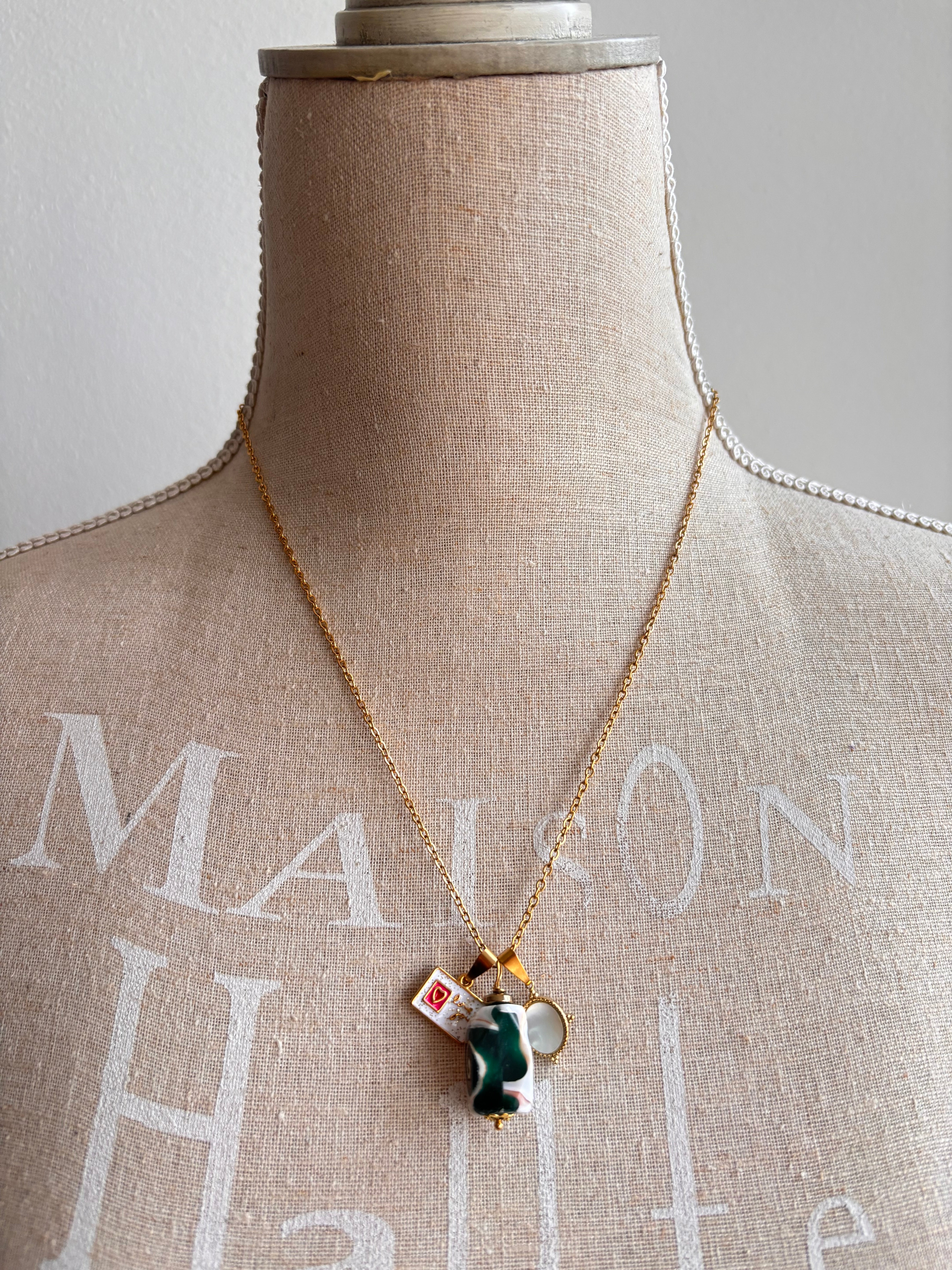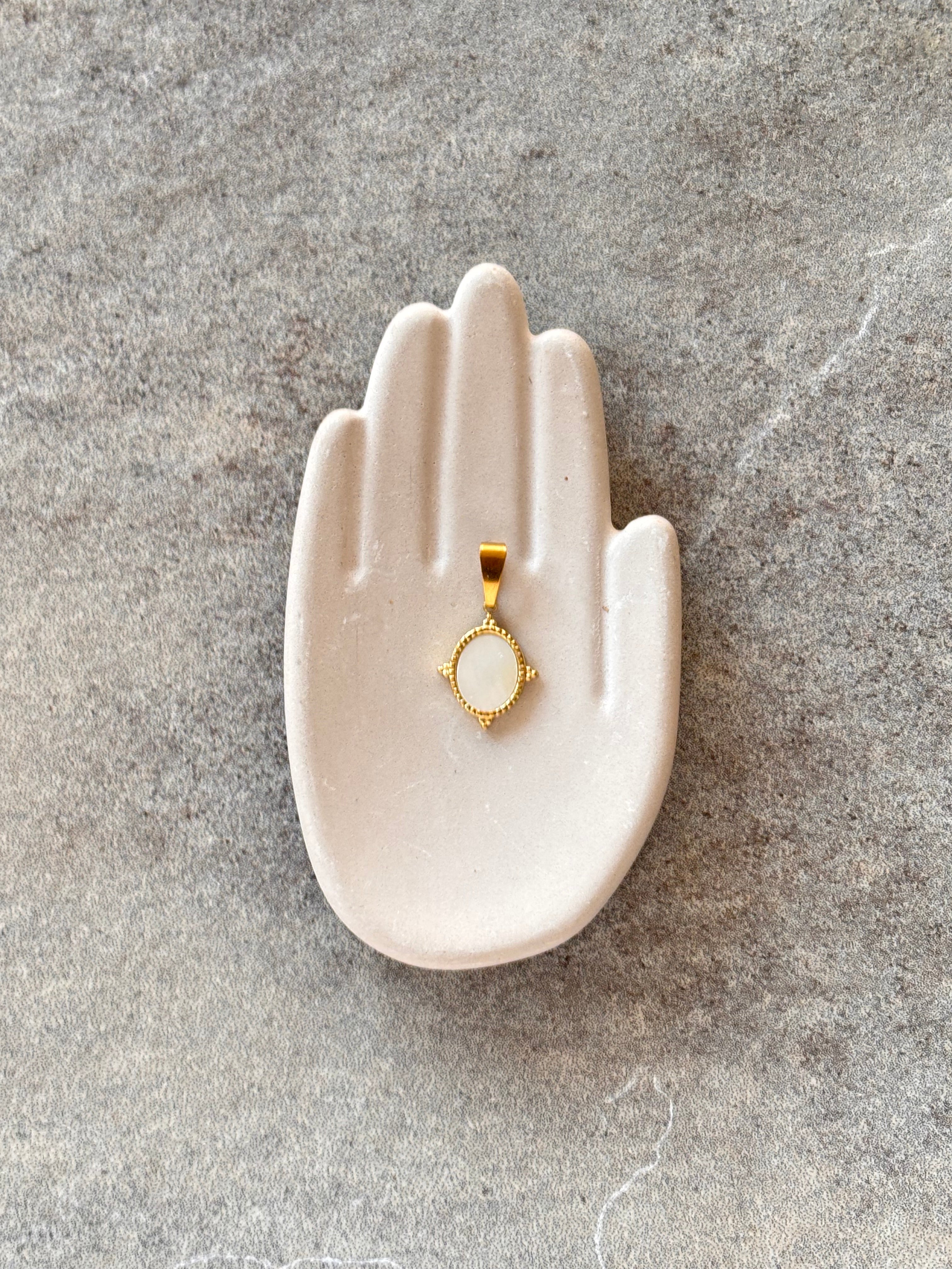 Specchietto in conchiglia lavorata, incastonata in acciaio inossidabile.