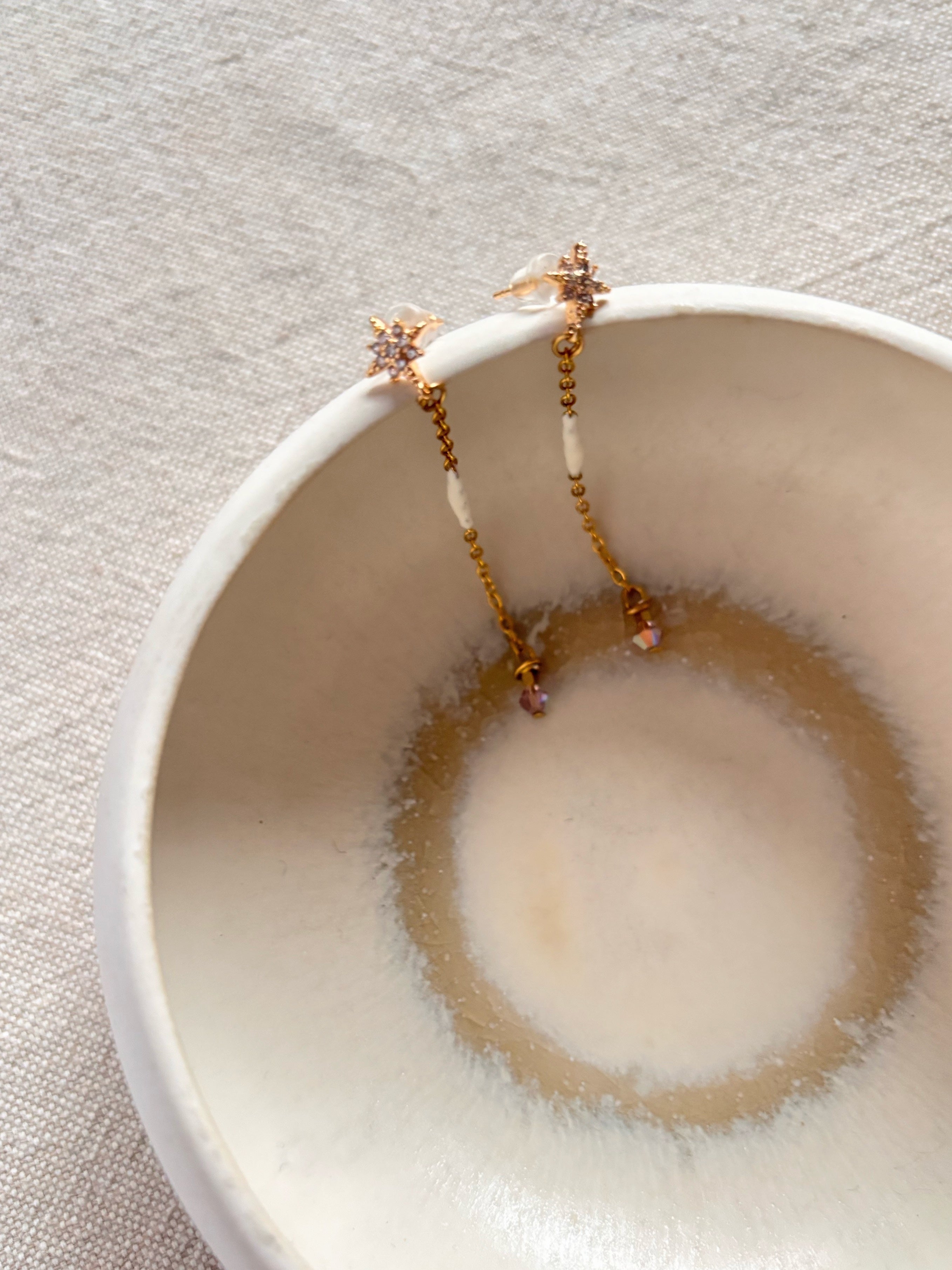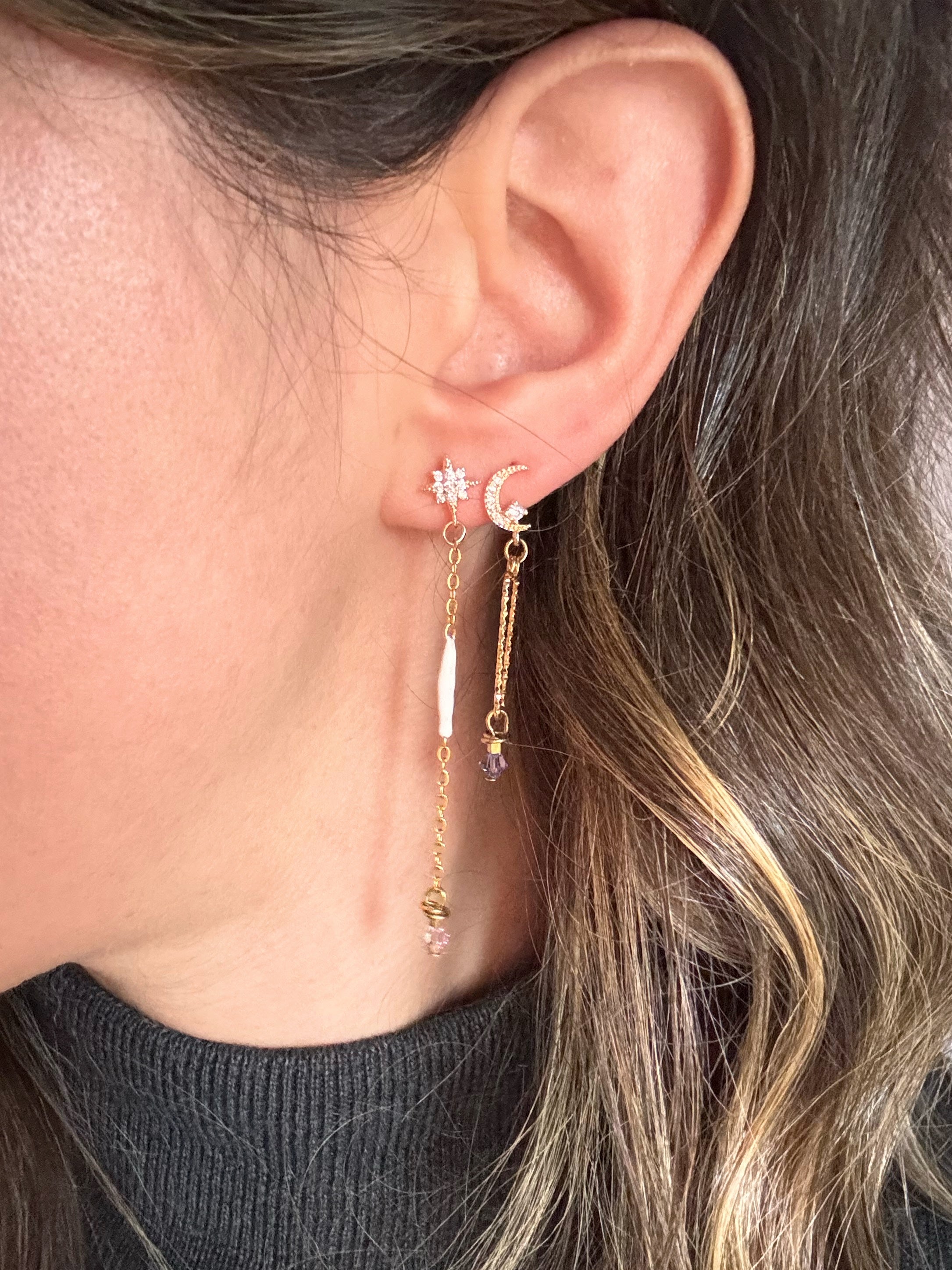 Orecchini in grado di brillare di luce propria grazie agli zirconi trasparenti al lobo e allo Swarovski sul fondo.