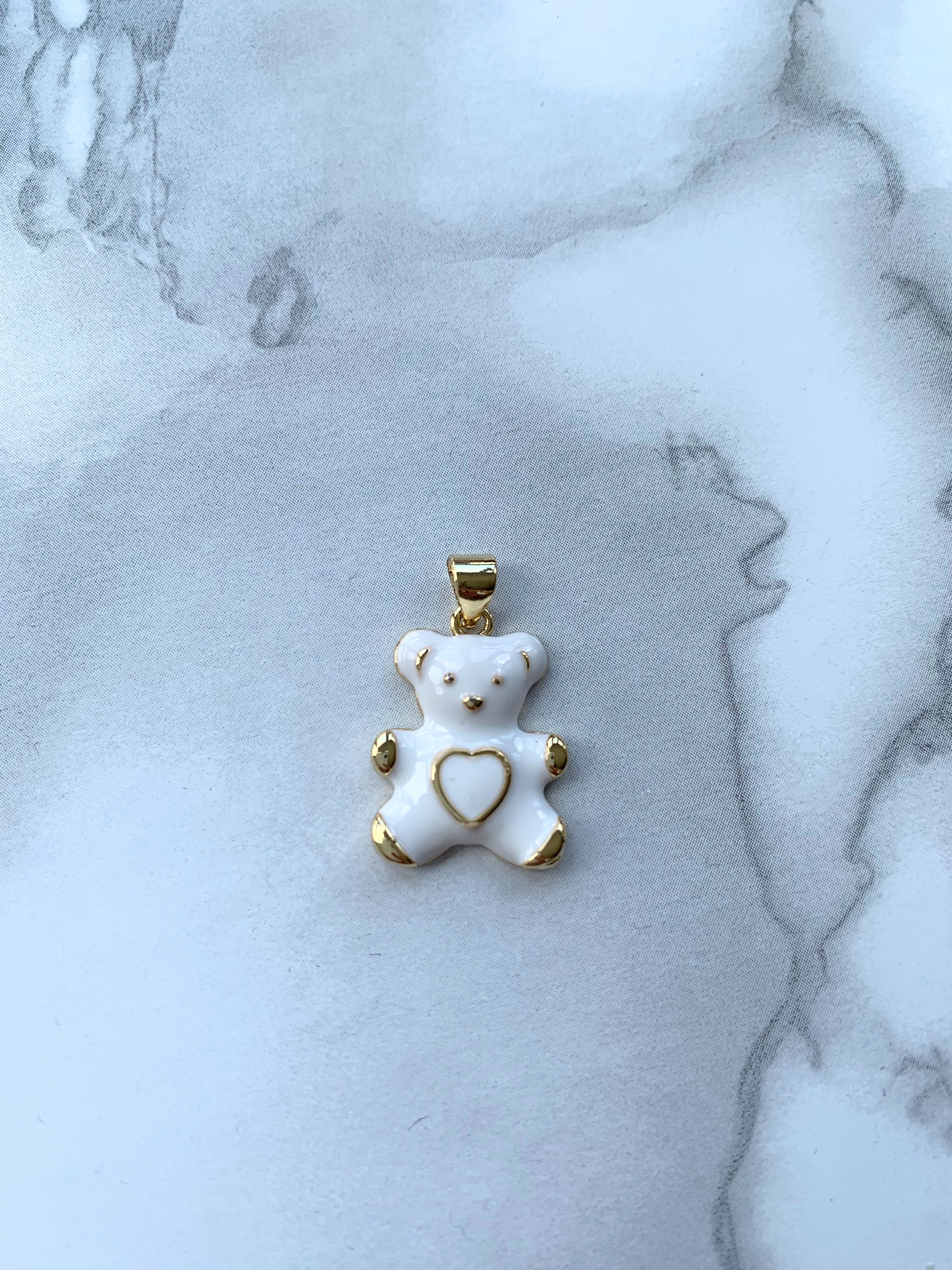 Ciondolo orsetto smaltato, realizzato in metallo colorato sul davanti ed anellino superiore in acciaio inossidabile color oro.