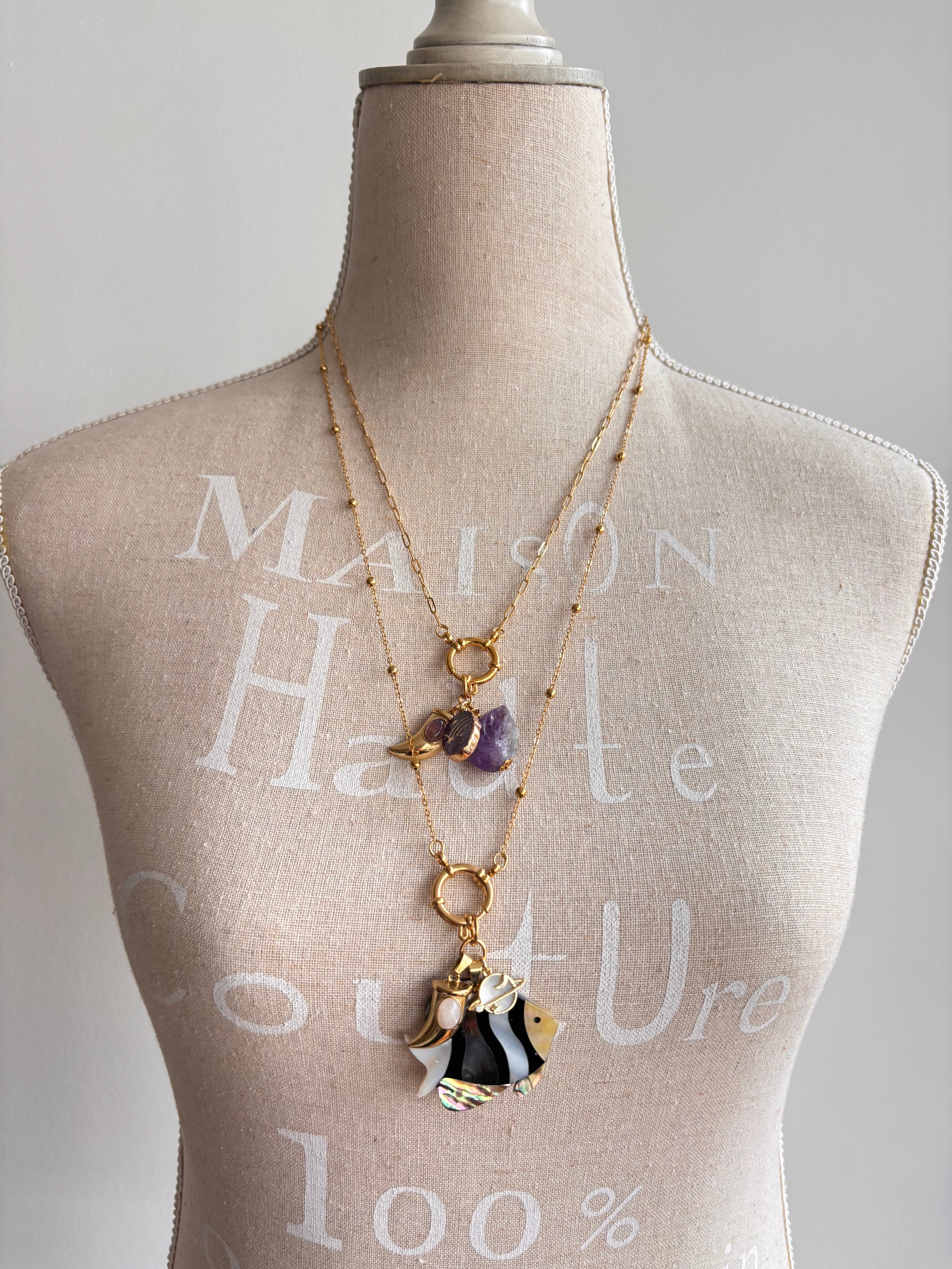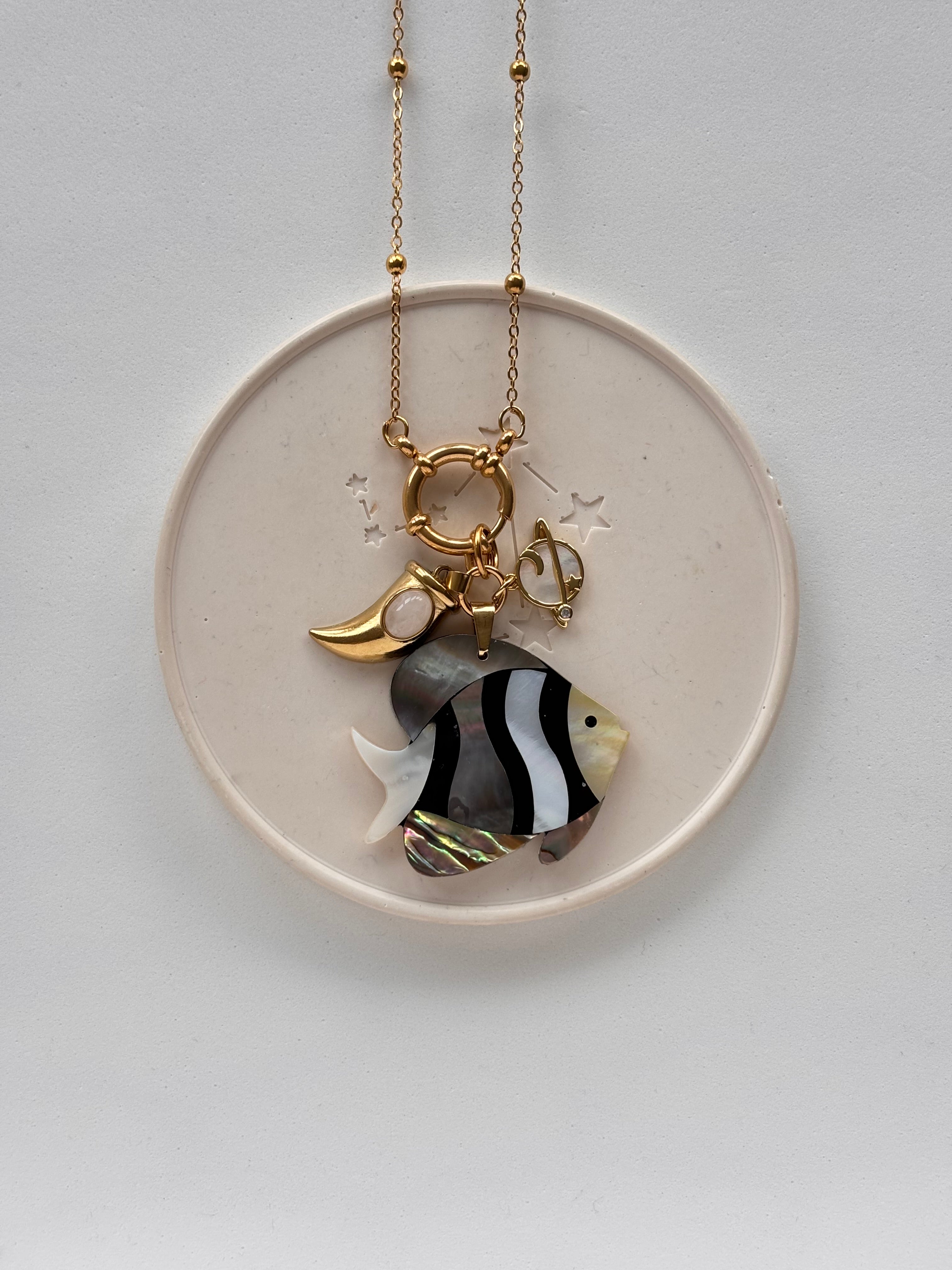 In questo gioiello troviamo una chiusura marinaio al centro sul davanti, che sostiene un mix di charms quali un pesce tropicale in madreperla, un corno con dettaglio in Quarzo, pietra dell’equilibrio, e piccolo pianeta in tono.