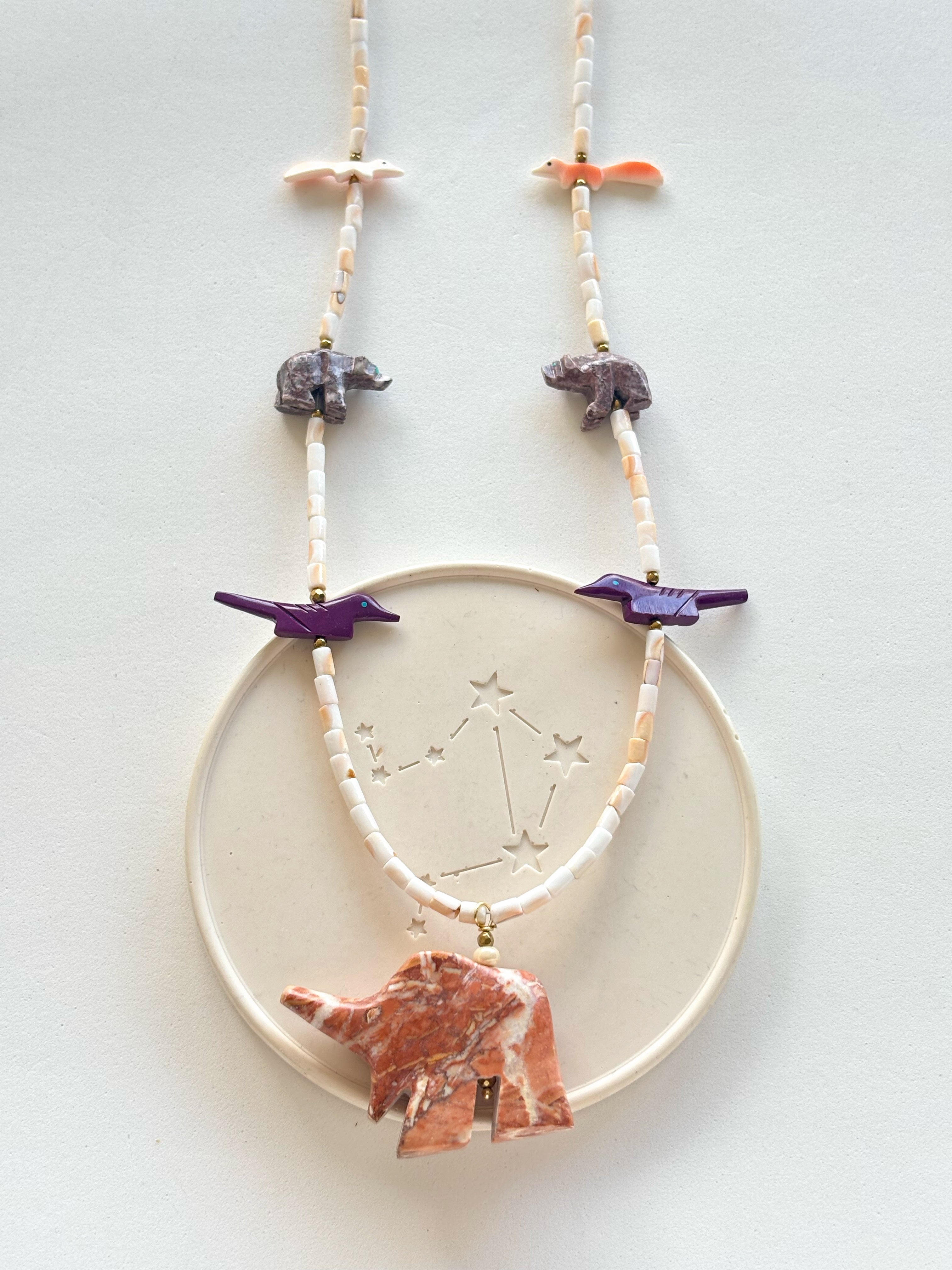 I colori terrosi di WINEMA vengono mitigati dal candore delle perline in conchiglia che troviamo sulla lunghezza, intervallata da altri piccoli animali selvatici.